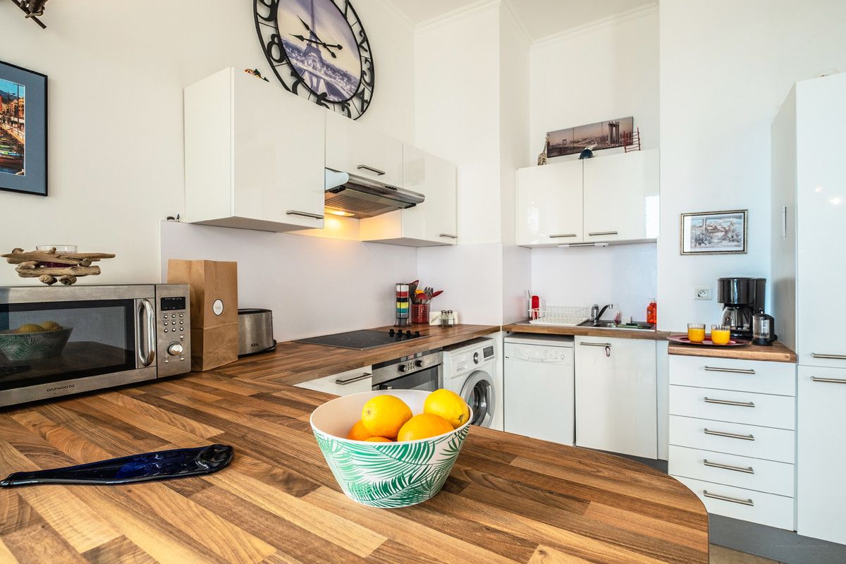 With three large French windows the open plan living space is designed to optimise light in the south-facing corner. Light wood flooring and worktops, and a splash of blue bring this room to life with a corner for relaxing on the L-shaped sofa, access to the balcony, and a round glass dining table. There is a TV with English news channels and wifi to stay connected.