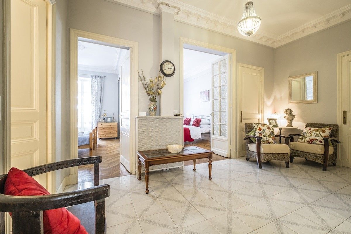 The grand entrance hall leads on to the cosy living room with an ornate fireplace, a three seater sofa and two individual chairs. Large French windows lead out onto a pretty covered terrace, complete with a ceiling fan will keep you cool on those hot days. Relax on the terrace or on the sofa and watch a bit of TV either in English or French, use the Wi-Fi provided throughout the apartment.