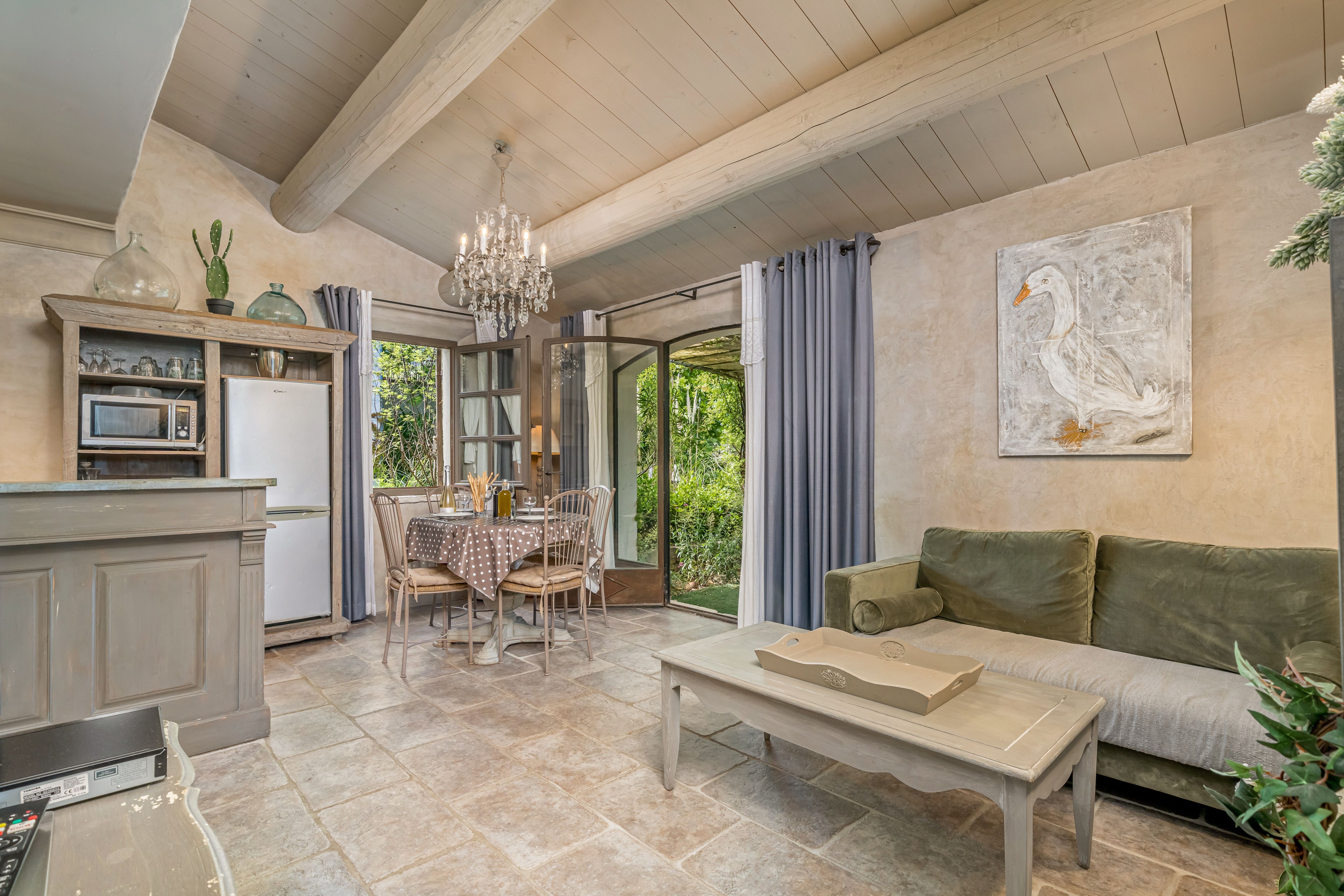 Set in the Luberon Regional Park on the edge of Oppède-le-Vieux, this farmhouse apartment delivers quite a setting. Views reaching to Mont Ventoux can be admired from the shared heated swimming pool and Mediterranean gardens. Though the vistas are just as impressive from the shady private dining terrace back at the apartment. Inside, exposed beams, lime-plaster walls and a four-poster bed are just as you’d expect from a Provencal home. The kitchen is on the compact side, but with a barbecue for alfresco meals and nearby villages for dining out, it’s unlikely to hold you back.