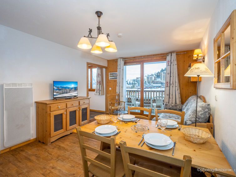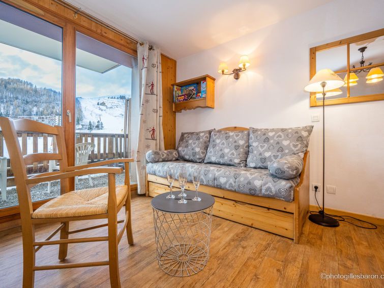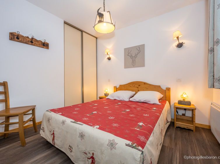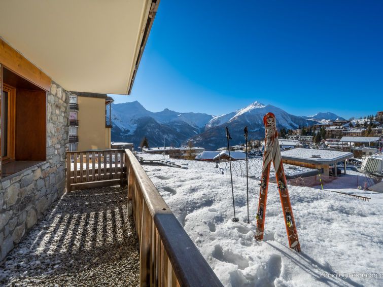 "T. Bergerie", 2-room apartment 36 m2. Object suitable for 6 adults. 1 room with 1 double bed and TV. Living room with 1 sofabed and 1 x 2 bunk beds, 1 pull-out bed. Kitchen (4 ceramic glass hob hotplates, microwave, freezer, electric coffee machine). Bath/WC, sep. WC. Terrace. View of the mountains.
