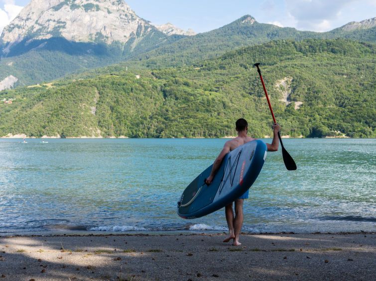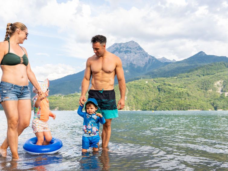 "Mobilhome Prestige 6/8 pers 3 chambres", 4-room mobile home 33 m2. Simple and comfortable furnishings: living/dining room with 1 double sofabed (1 x 140 cm, length 190 cm), dining table and TV (flat screen), air conditioning. Exit to the terrace. 1 room with 1 french bed (1 x 160 cm, length 200 cm).