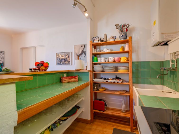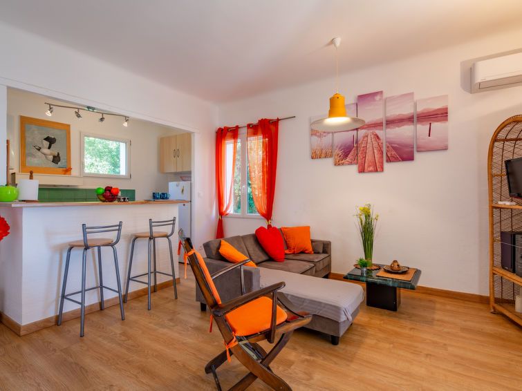 3-room house on 1st floor. Cosy furnishings: living/dining room with panoramic window with TV (flat screen), hi-fi system and air conditioning. Exit to the terrace. 1 room with 1 french bed (2 x 80 cm, length 190 cm), fan. 1 room with 2 x 1 bunk beds (90 cm, length 190 cm), fan. Open kitchen (3 induction hot plates, toaster, kettle, microwave, freezer, electric coffee machine, Capsules for coffee machine (Nespresso) extra).