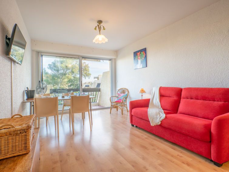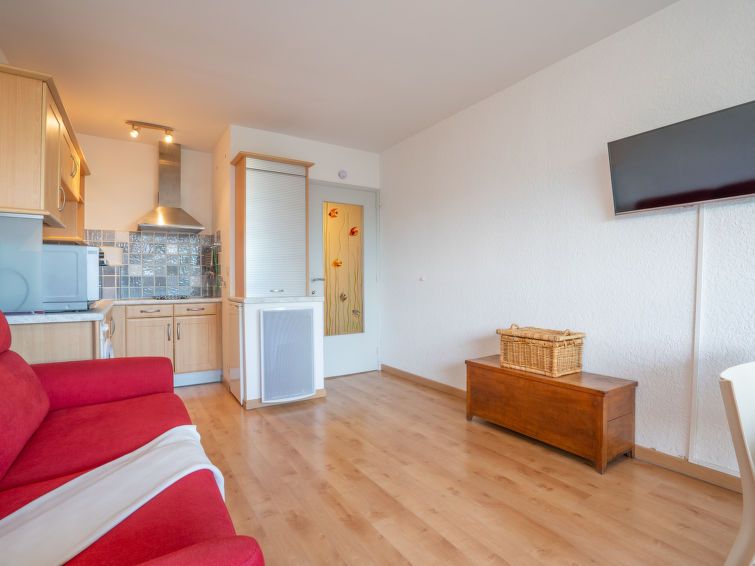 1-room studio 30 m2 on 1st floor, south facing position. Simple and comfortable furnishings: living/dining room with panoramic window with 1 double sofabed (1 x 160 cm, length 200 cm), TV (flat screen), fan. Exit to the terrace. Sleeping alcove with 1 x 2 bunk beds (80 cm, length 190 cm).