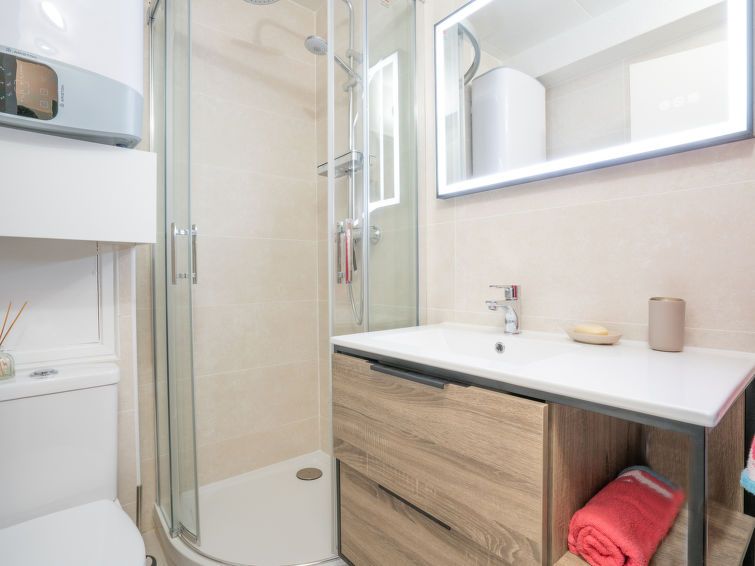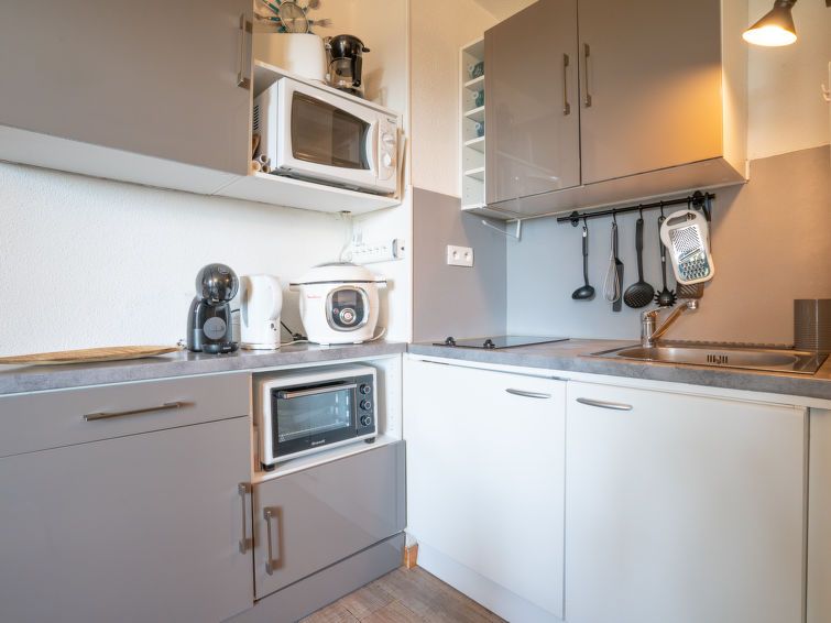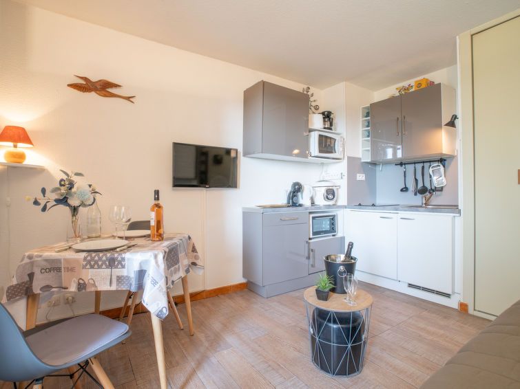 1-room studio 20 m2 on 2nd floor. Beautiful furnishings: living/dining room with 1 double sofabed (1 x 160 cm, length 200 cm), TV (flat screen), fan. Exit to the terrace. Kitchenette (mini-oven, 2 ceramic glass hob hotplates, toaster, kettle, microwave, electric coffee machine). Shower/WC.