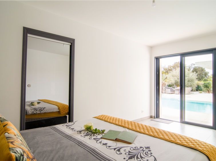5-room villa 250 m2 on 2 levels. Very modern and cosy furnishings: large living/dining room with panoramic window with TV (flat screen), electric shutters. Exit to the swimming pool. 1 large room with panoramic window Dressing room with 1 french bed (1 x 160 cm, length 200 cm), bath/shower/WC, double hand-basin and TV (flat screen), electric shutters.