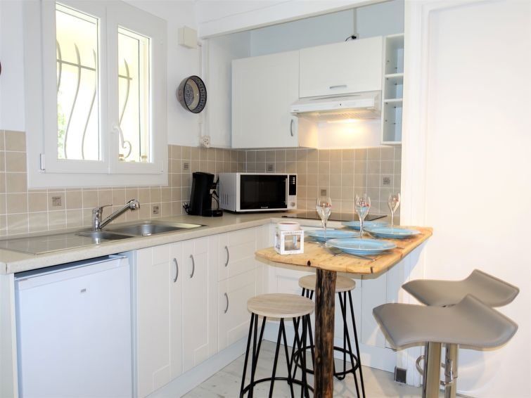 2-room apartment 30 m2, on the upper ground floor, east facing position. Beautiful furnishings: lounge with 1 double sofabed (1 x 140 cm, length 190 cm), TV (flat screen). Exit to the terrace, to the patio. 1 room with 2 beds (80 cm, length 190 cm). Exit to the balcony. Open kitchen (mini-oven, 4 induction hot plates, toaster, kettle, microwave, freezer, electric coffee machine, Capsules for coffee machine (Senseo) extra) with dining nook.