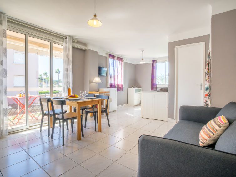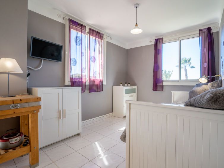 1-room apartment 30 m2 on 1st floor. Simple furnishings: living/dining room with 1 pull-out bed (2 x 80 cm, length 200 cm), TV. Exit to the terrace. Kitchenette (2 ceramic glass hob hotplates, toaster, kettle, microwave, freezer, electric coffee machine, Capsules for coffee machine (Senséo) extra).