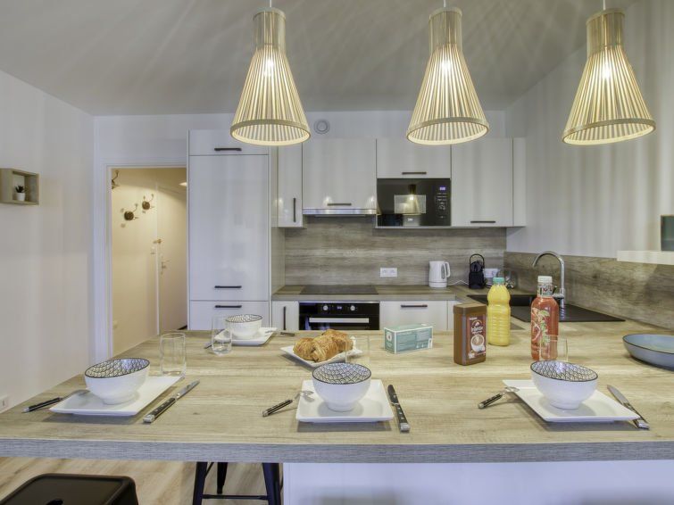 2-room apartment 37 m2 on 1st floor. Fully renovated in 2021, comfortable and beautiful furnishings: living/dining room with 1 double sofabed (140 cm, length 190 cm), TV (flat screen), air conditioning. Exit to the terrace. 1 room with 2 beds (90 cm, length 190 cm). Open kitchen (oven, dishwasher, 3 ceramic glass hob hotplates, toaster, kettle, microwave, electric coffee machine, Capsules for coffee machine (Nespresso + Filtre) extra).