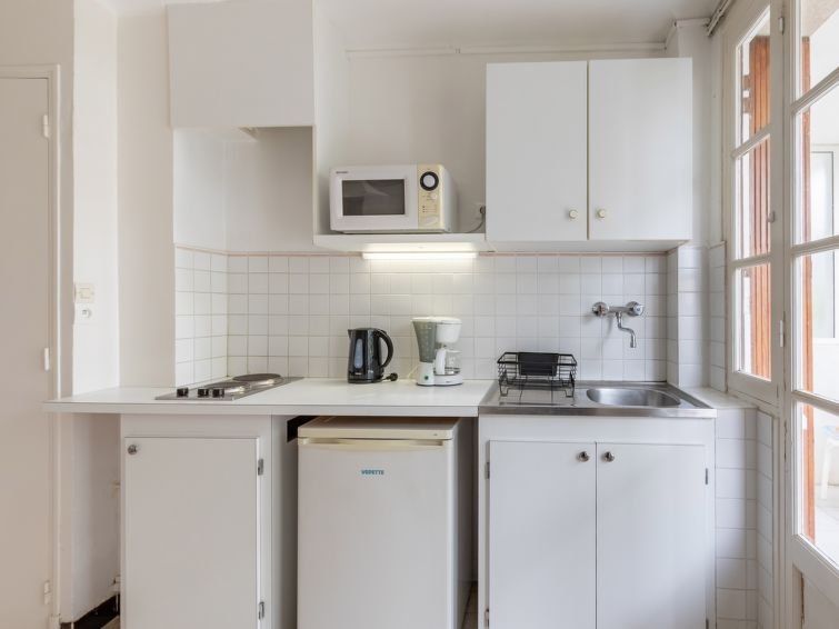 2-room apartment 38 m2 on 1st floor. Simple and practical furnishings: living/dining room with 1 bed (80 cm, length 190 cm), TV. Exit to the terrace. 1 room with 1 french bed (140 cm, length 190 cm). Kitchenette (2 hot plates, kettle, microwave, electric coffee machine). Shower, sep.