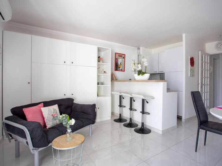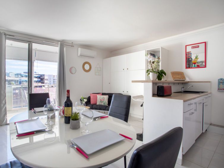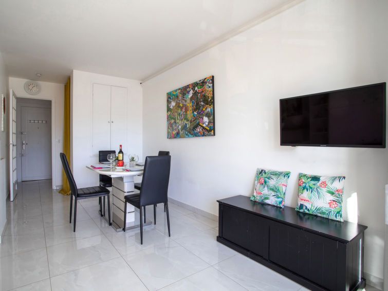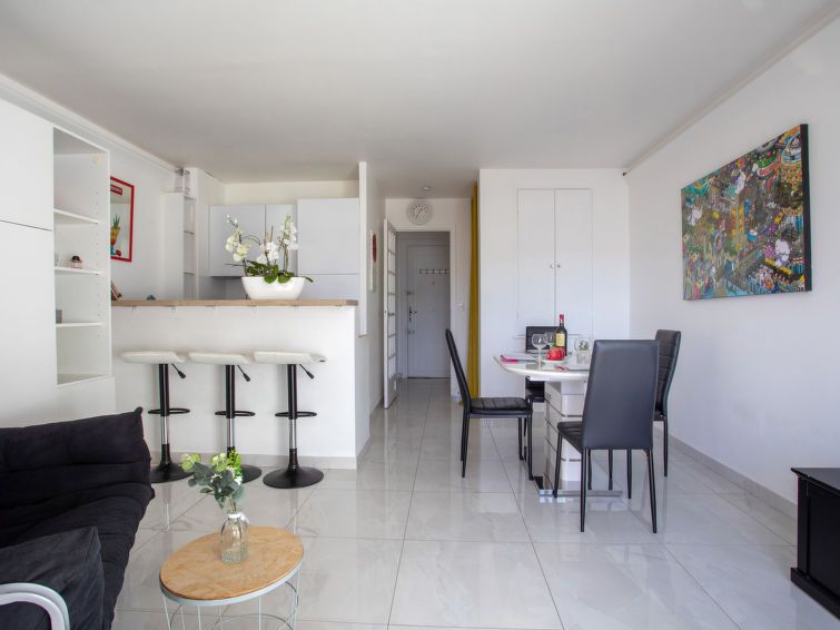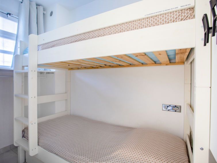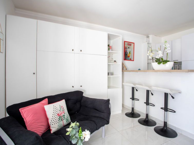 1-room apartment 38 m2 on 2nd floor, south facing position. Bright, modern furnishings: living/dining room with 1 double wall-trunk bed (140 cm, length 190 cm), TV (flat screen). Exit to the loggia. Alcove with 1 x 2 bunk beds (80 cm, length 190 cm). Kitchenette (dishwasher, 2 induction hot plates, toaster, kettle, freezer, electric coffee machine, Capsules for coffee machine (nespresso) extra, combination microwave).