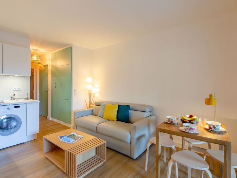 2-room apartment 31 m2, on the ground floor. Renovated in 2023: living/dining room with 1 double sofabed (1 x 140 cm, length 190 cm), TV and flat screen. Exit to the terrace. 1 room with 1 french bed (1 x 160 cm, length 200 cm). Open kitchen (oven, dishwasher, 2 induction hot plates, toaster, kettle, microwave, freezer, electric coffee machine).