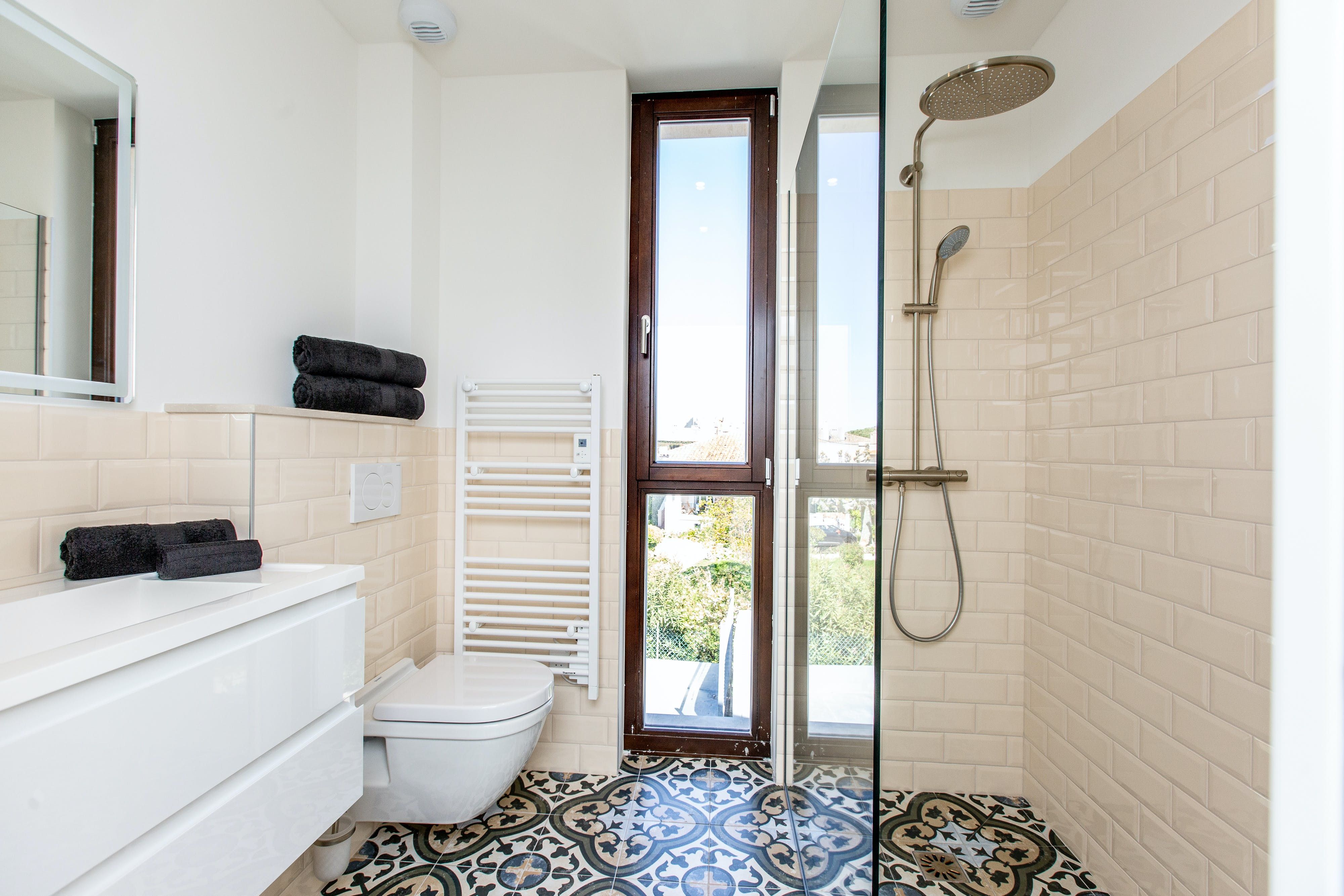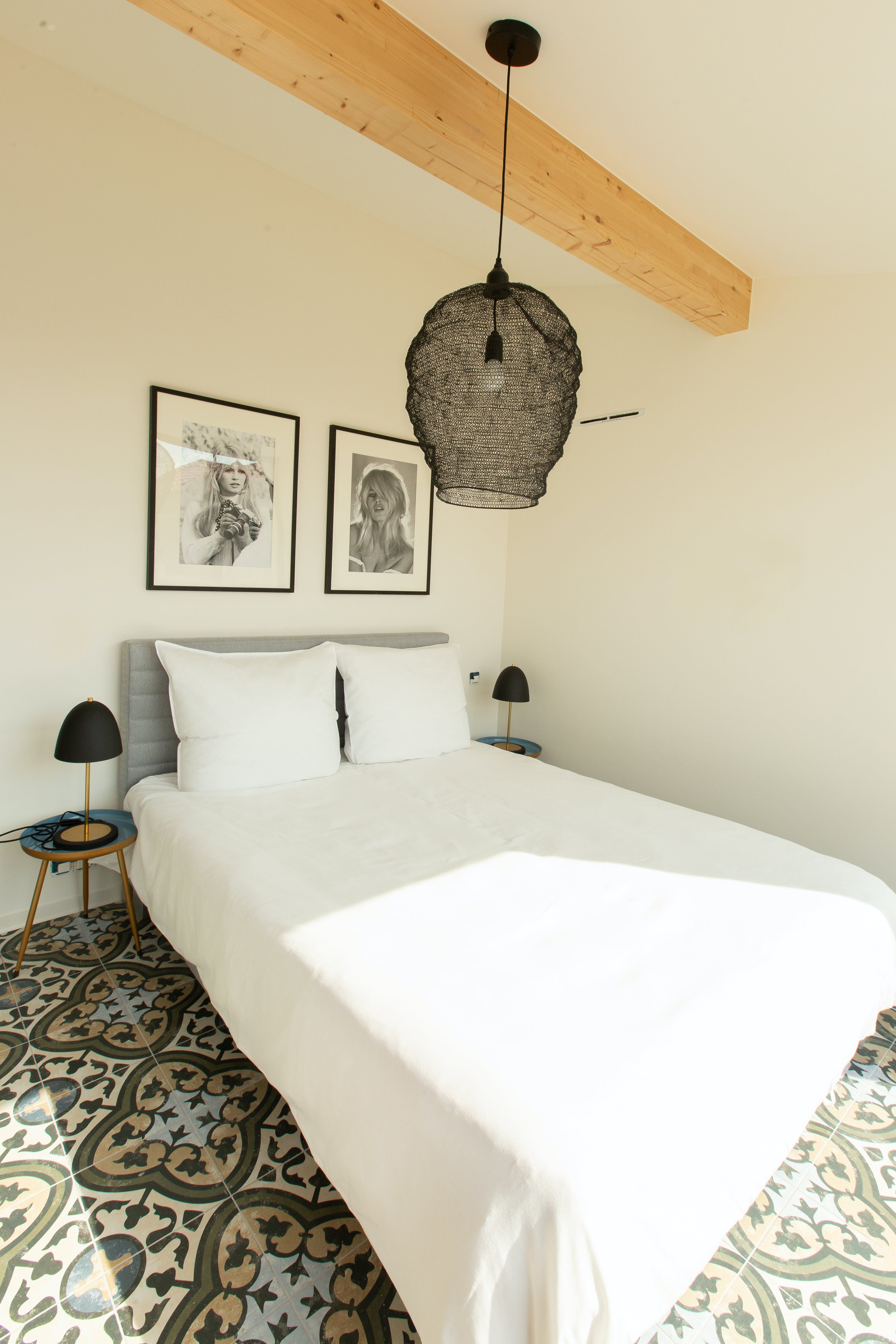 Only built in 2021, the interior is fresh and contemporary, and saved from the anonymity of over-ubiquitous minimalist design by the boldly patterned tiling underfoot, some eye-catching metallic light fixtures and the black-and-white artwork dotted across the walls. We've got kind words for the modern kitchen, which is all clean lines and sleek surfaces, as well as the terraces – not only is there a space on the ground level to dine in the open air, but the upper-floor balcony is fabulous for sunset-watching.