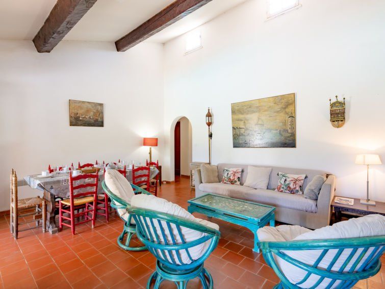 "Cascabelle", 5-room house 150 m2 on 2 levels. Practical and rustic furnishings: living/dining room with open-hearth fireplace (only for decoration), dining table and TV. Exit to the terrace. 2 rooms, each room with 2 beds (90 cm, length 190 cm). Exit to the terrace. 1 room with 2 beds (90 cm, length 190 cm), hand-basin.