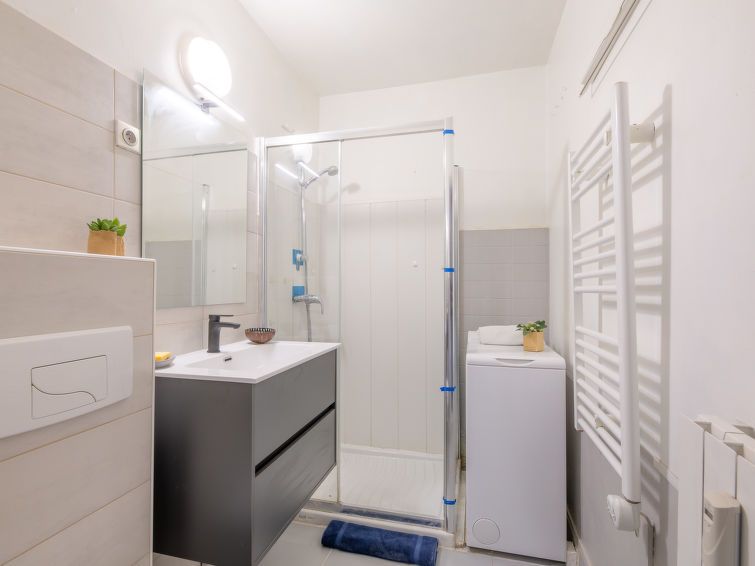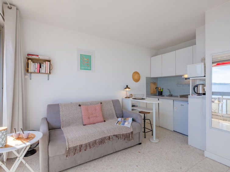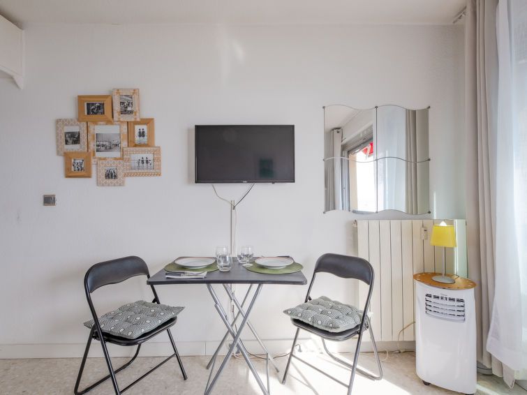 1-room studio 20 m2 on 2nd floor, south facing position. Bright, very simple furnishings: living/sleeping room with 1 double sofabed (140 cm, length 190 cm), TV (flat screen). Small kitchenette (2 induction hot plates, toaster, kettle, microwave, electric coffee machine). Shower/WC.