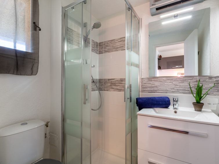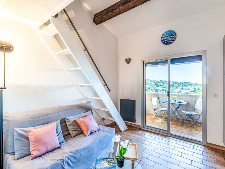 1-room studio 20 m2 on 1st floor. Cosy furnishings: living/dining room with 1 double sofabed (1 x 140 cm, length 190 cm), TV and flat screen. Exit to the balcony. Open kitchen (2 ceramic glass hob hotplates, toaster, kettle, microwave, electric coffee machine). Shower/WC. Electric heating.