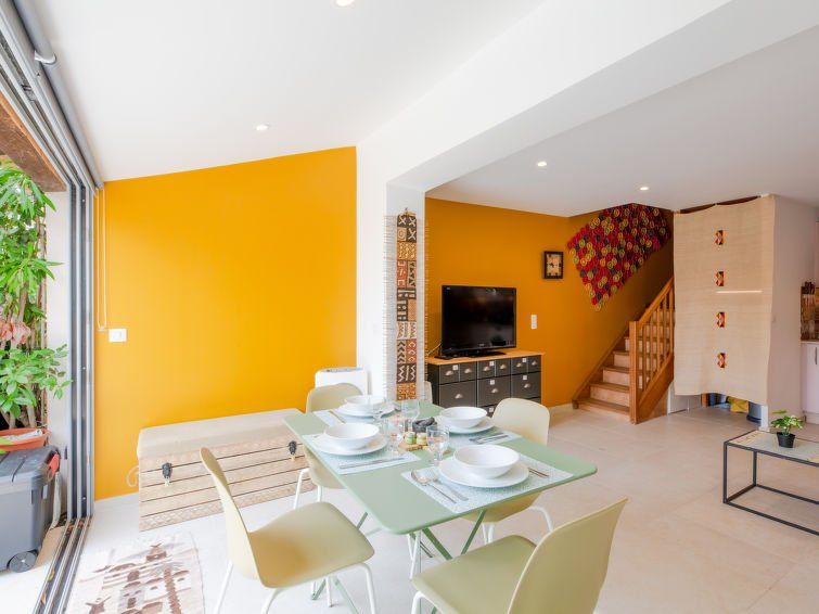 3-room terraced house 43 m2 on 2 levels, south facing position. Spacious, beautiful furnishings: living/dining room with 1 double sofabed (1 x 140 cm, length 190 cm), TV (flat screen). Exit to the terrace. Open kitchen (dishwasher, 3 ceramic glass hob hotplates, toaster, kettle, microwave, freezer, electric coffee machine).