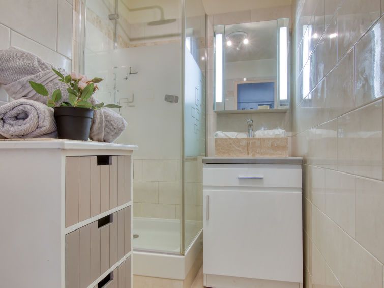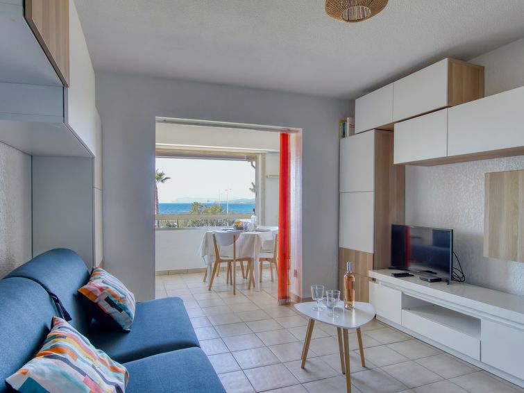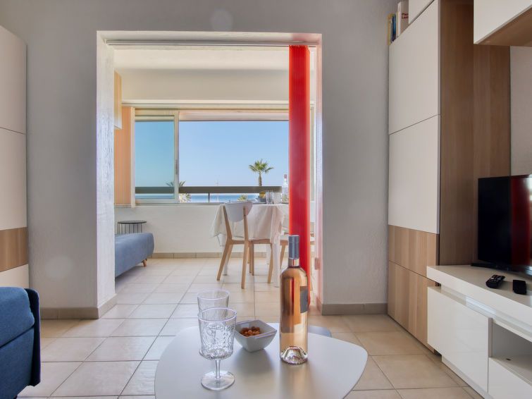 2-room apartment 35 m2 on 1st floor. Bright, comfortable and modern furnishings: living/dining room with 1 double sofabed (160 cm, length 190 cm), dining table and TV (flat screen), fan. Sleeping alcove 5 m2 with sliding door with 1 french bed (140 cm, length 190 cm), fan. Kitchenette (oven, 2 ceramic glass hob hotplates, toaster, kettle, microwave, electric coffee machine, Capsules for coffee machine (NESPRESSO) extra).