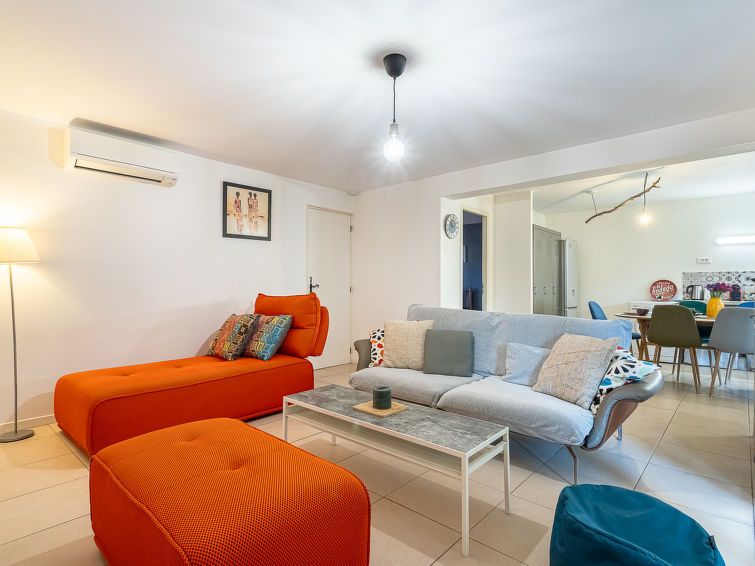"Bleu Azur", 3-room apartment 65 m2, on the ground floor. Object suitable for 4 adults + 2 children. Comfortable and beautiful furnishings: living room with TV, flat screen and air conditioning. Exit to the terrace. 2 rooms, each room with 1 sofabed (80 cm, length 190 cm), 1 double bed (140 cm, length 190 cm).