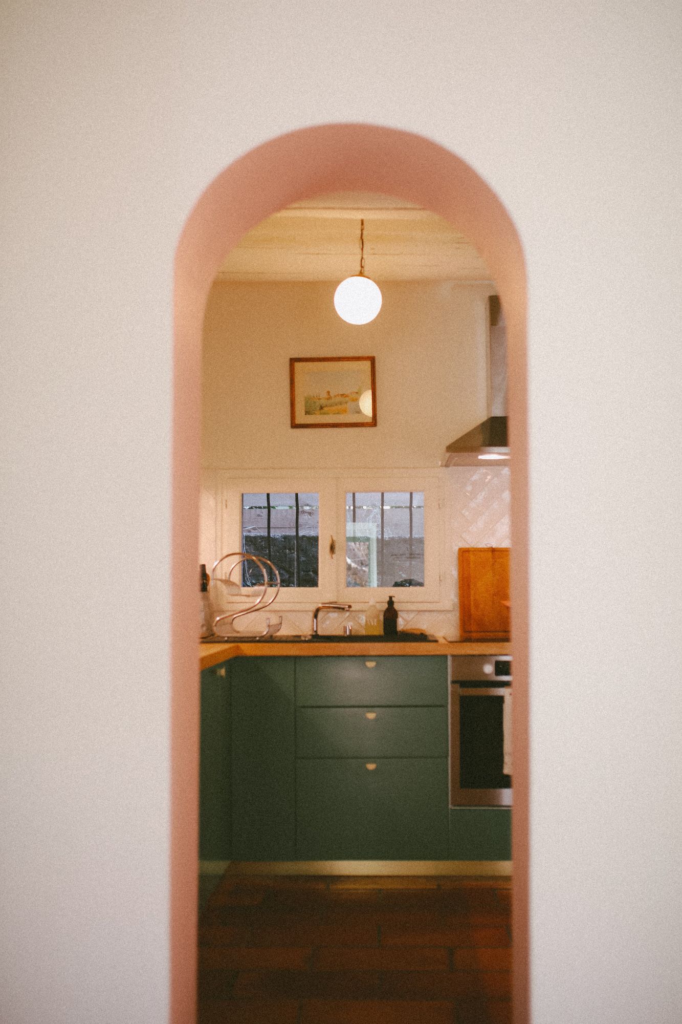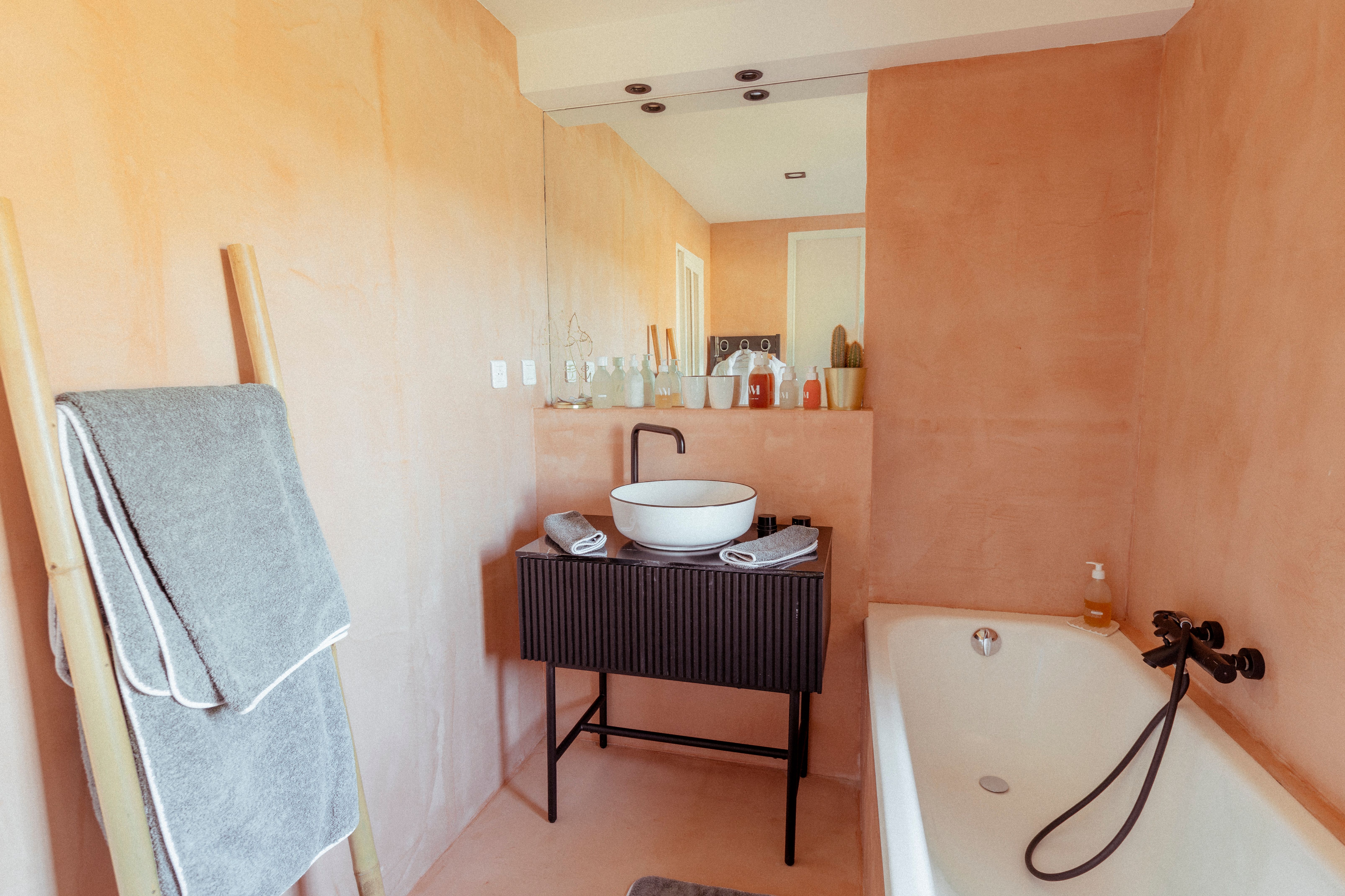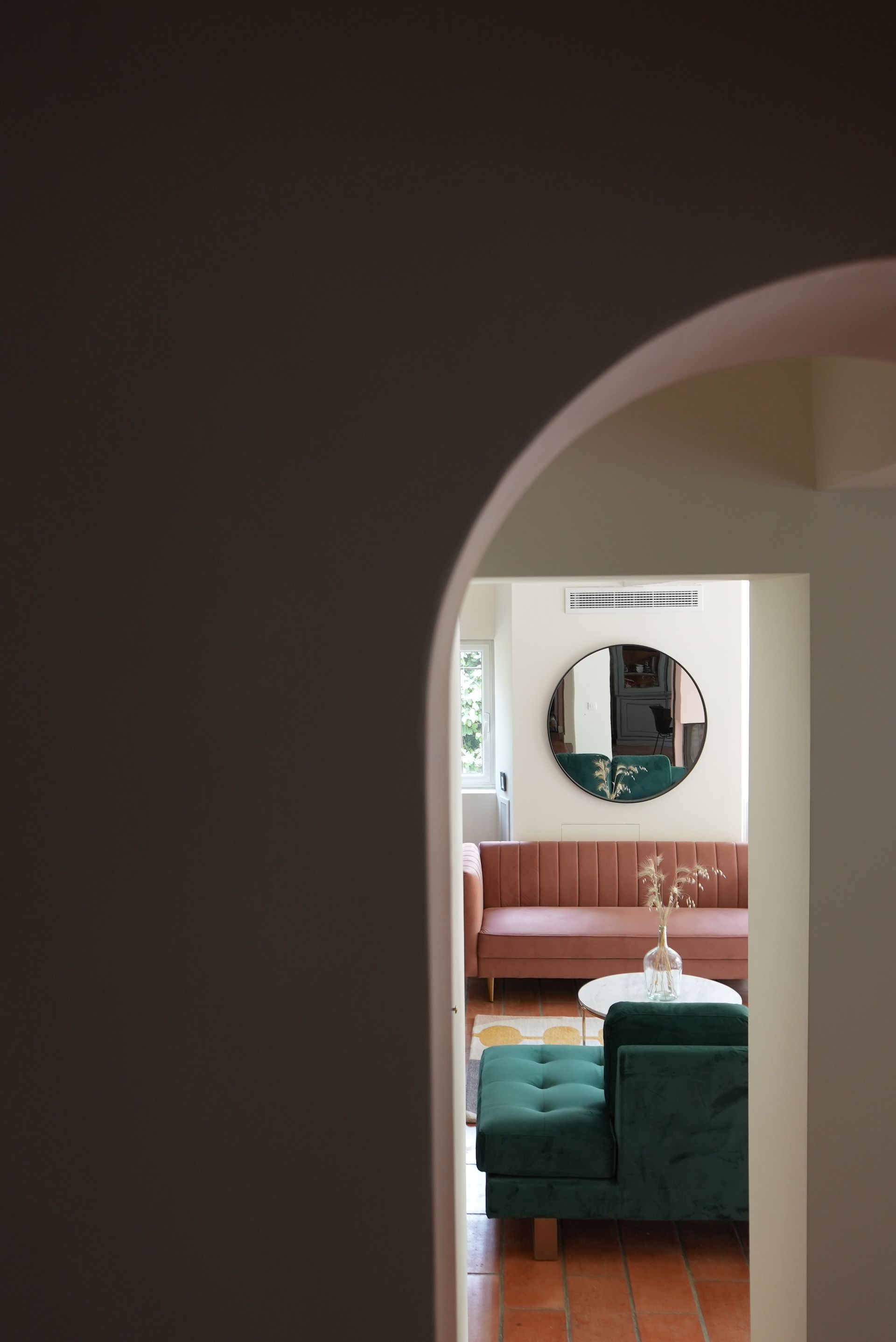 Inside, it’s warm and welcoming, with pastel pink tones and rustic terracotta tiles. The chic, art-deco-inspired living room and dining area tempts cosy evenings spent snuggled up besides the crackling fire playing light-hearted games and drinking wine.