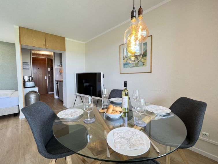 "Lichtblick", 1-room apartment 36 m2, on the ground floor. Bright, partly renovated in 2024, modern and tasteful furnishings: living/sleeping room with 1 sofabed (80 cm, length 200 cm), 1 double bed (2 x 80 cm, length 200 cm), satellite TV (flat screen). Exit to the balcony. Kitchenette (dishwasher, 2 induction hot plates, toaster, kettle, electric coffee machine, combination microwave).