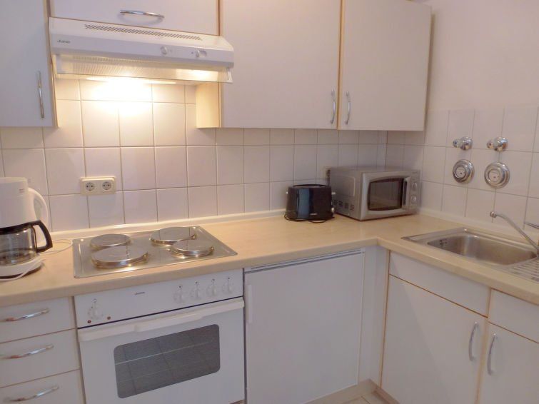 2-room apartment 56 m2 on 3rd floor. Living/dining room with 1 sofabed and satellite TV (flat screen), radio. Exit to the balcony. 1 large double bedroom. Small kitchen (4 hot plates, oven, microwave, electric coffee machine). Shower/WC. Balcony furniture. Garage space n 67. Please note: non-smokers only..