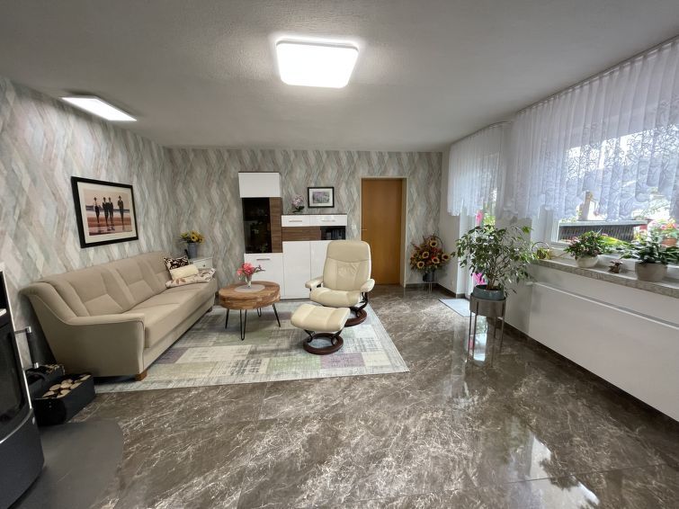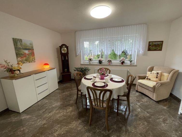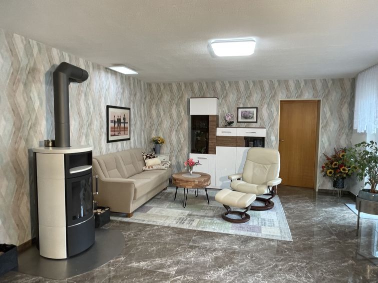 "Spatzenparadies", 2-room apartment 77 m2, on the ground floor. Spacious and bright, tasteful and cosy furnishings: living/dining room with Scandinavian wood stove, dining table and satellite TV (flat screen), radio. Exit to the terrace. 1 room with 1 double bed (180 cm, length 200 cm).