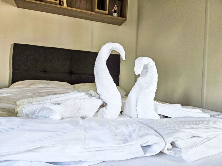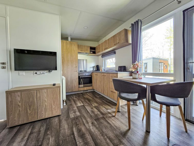 The cottage looks beautiful. Everything is brand new, clean, and neat. The kitchen is fully equipped. A nice corner sofa, a double bed, a bathroom with a shower, toilet, and sink with a cabinet above and below. There's even a hairdryer. There's a lovely seating area outside.