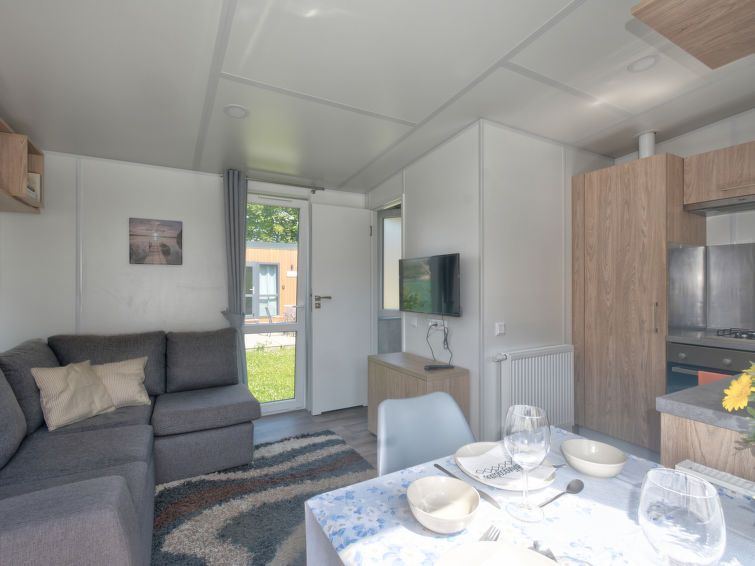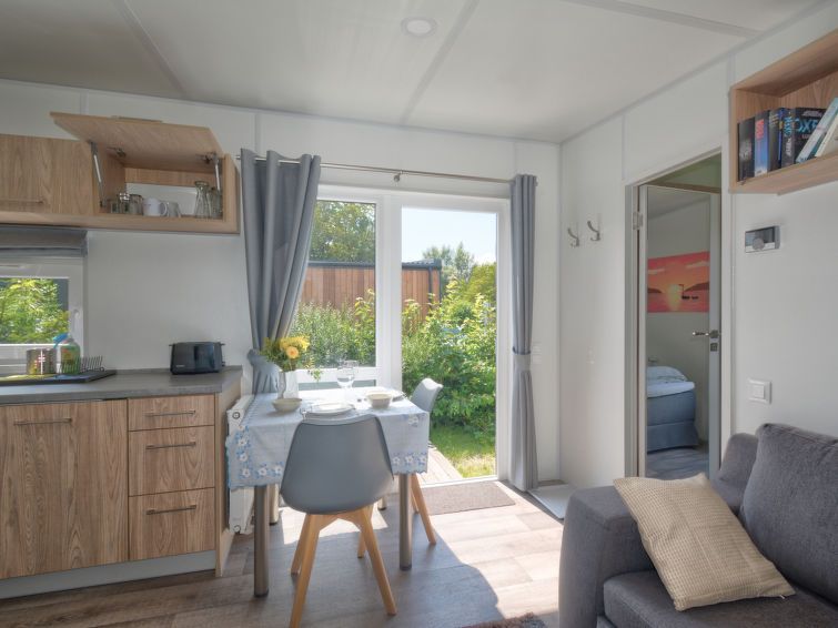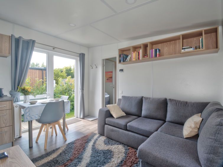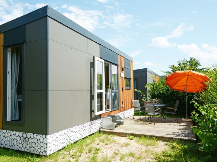 "Tiny Haus Conny", 2-room mobile home 25 m2. Object suitable for 2 adults + 2 children. Cosy furnishings: living/sleeping room with 1 sofabed (120 cm, length 170 cm), satellite TV and fan. 1 room with 1 french bed (140 cm, length 200 cm). Open kitchen (oven, Gas stove, 2 gas rings, toaster, kettle, microwave, electric coffee machine).