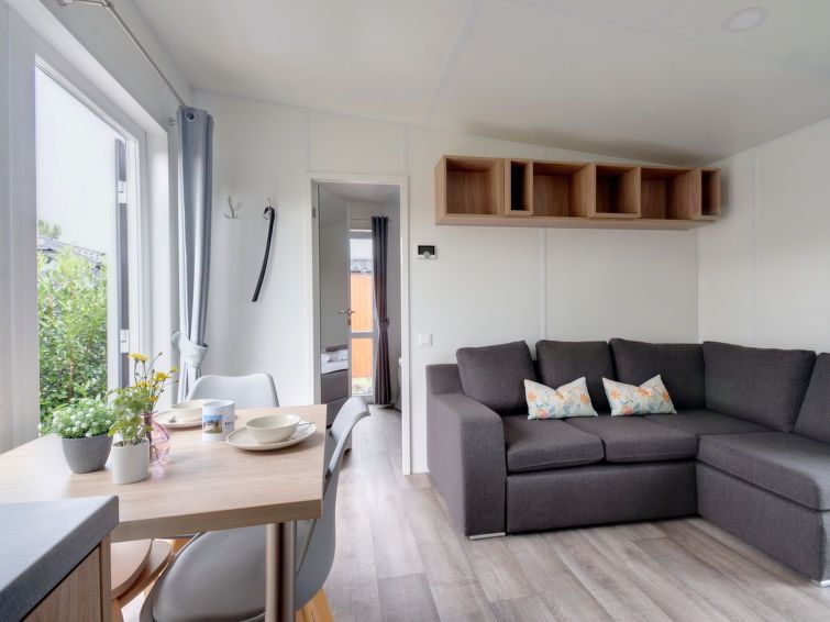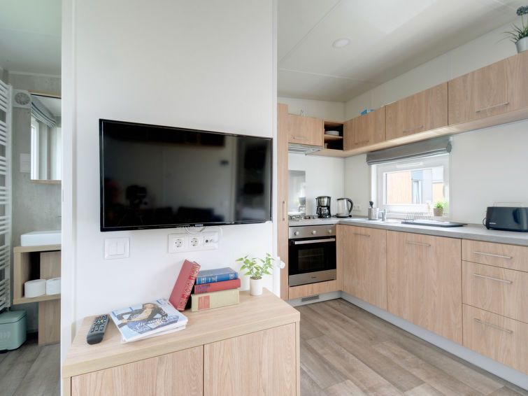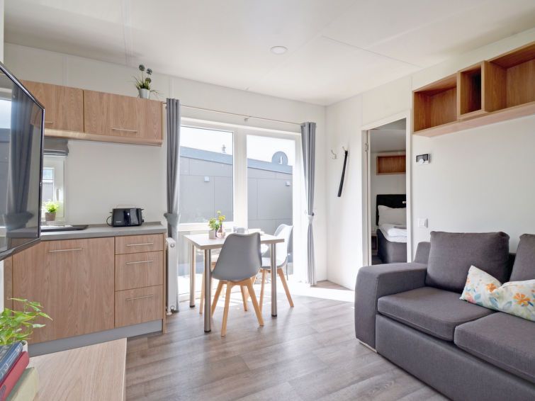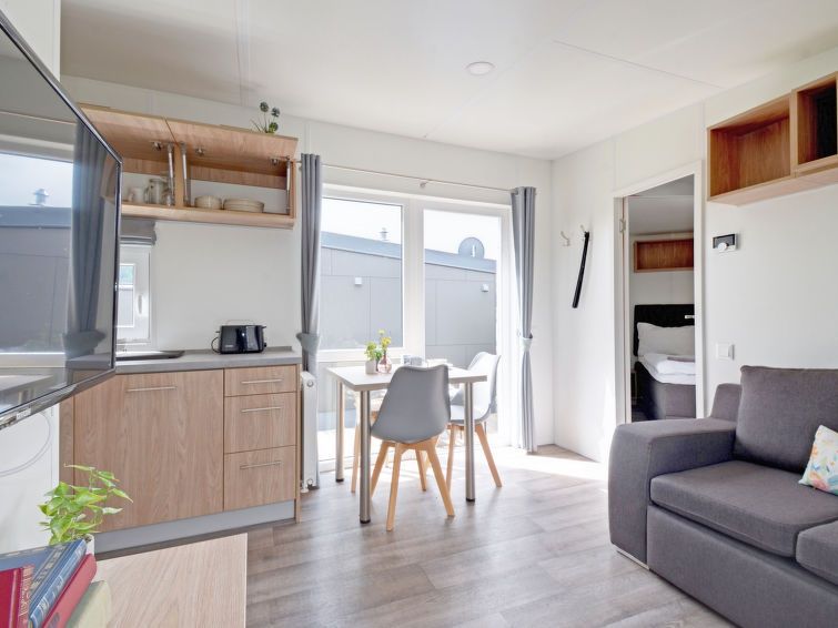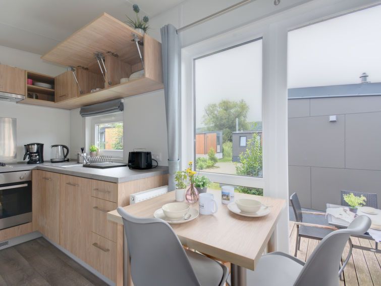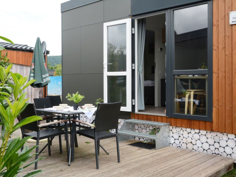 "Tiny Haus Erwine", 2-room mobile home 25 m2. Object suitable for 2 adults + 2 children. Cosy furnishings: living/sleeping room with 1 sofabed (120 cm, length 170 cm), satellite TV. 1 room with 1 french bed (140 cm, length 200 cm). Open kitchen (oven, Gas stove, 2 gas rings, kettle, electric coffee machine).