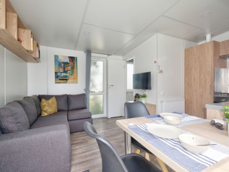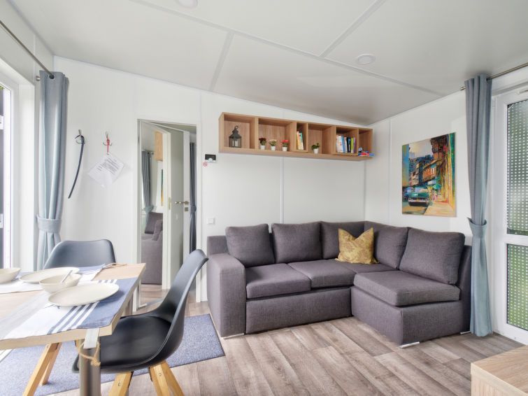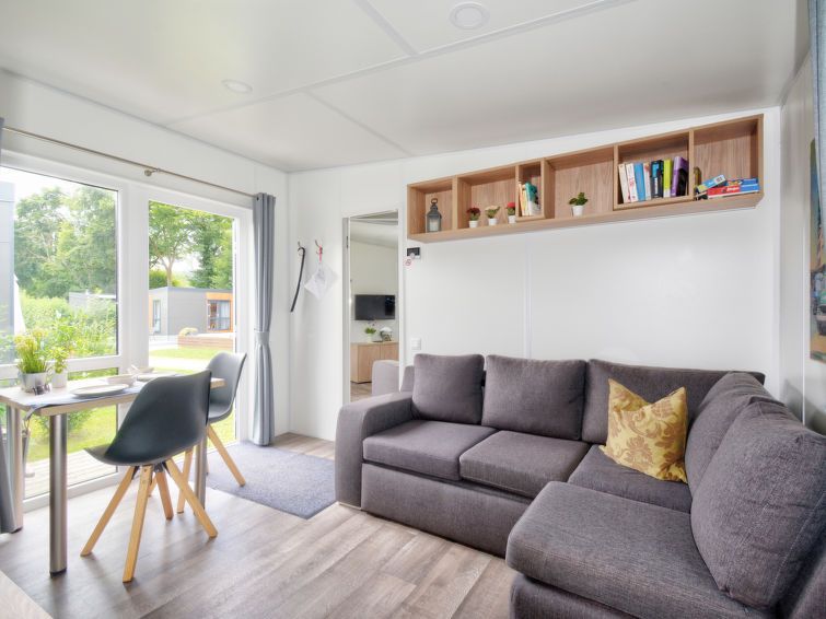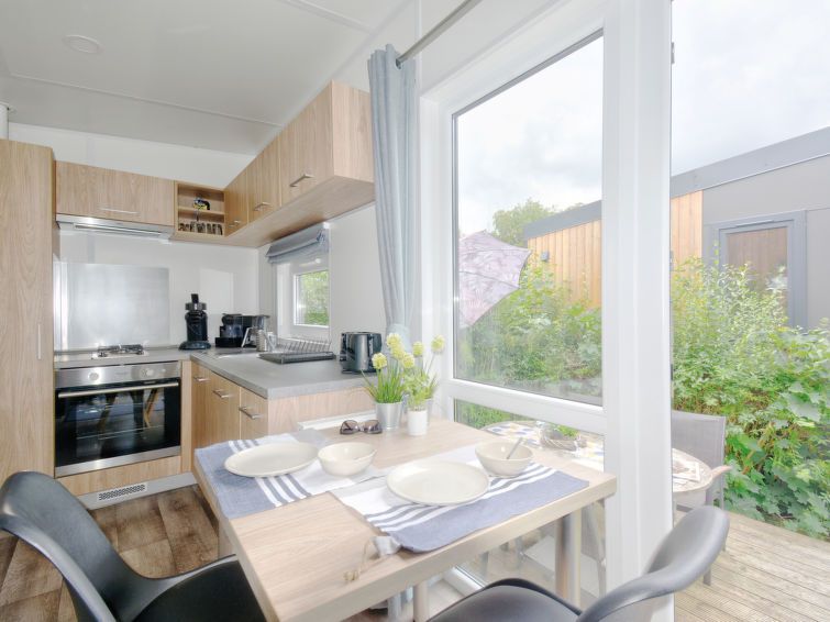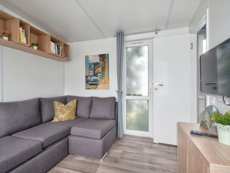 "Tiny Haus Kiwi", 2-room mobile home 25 m2. Object suitable for 2 adults + 2 children. Cosy furnishings: living/sleeping room with 1 sofabed (120 cm, length 170 cm), satellite TV. 1 room with 1 french bed (140 cm, length 200 cm). Open kitchen (oven, Gas stove, 2 gas rings, kettle, electric coffee machine).