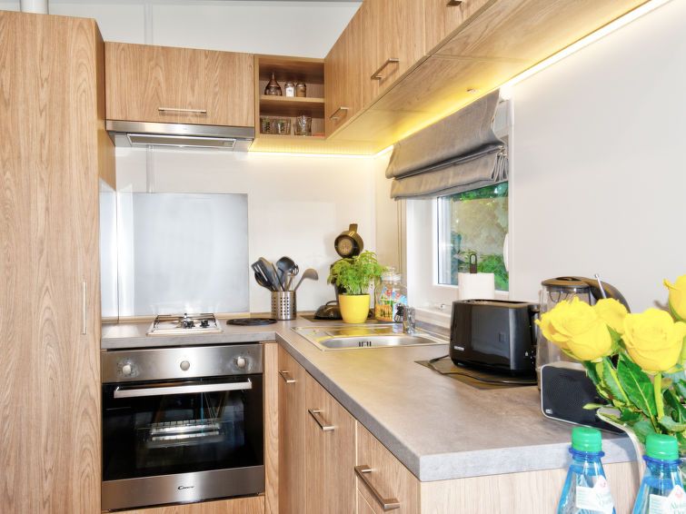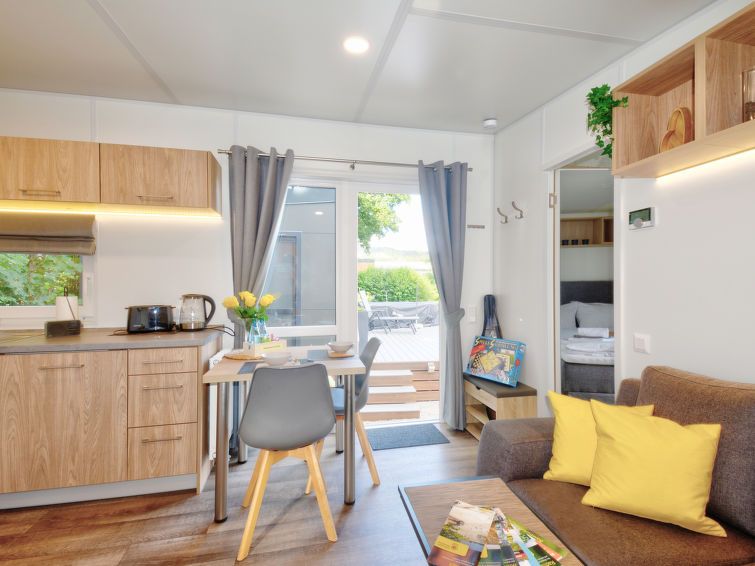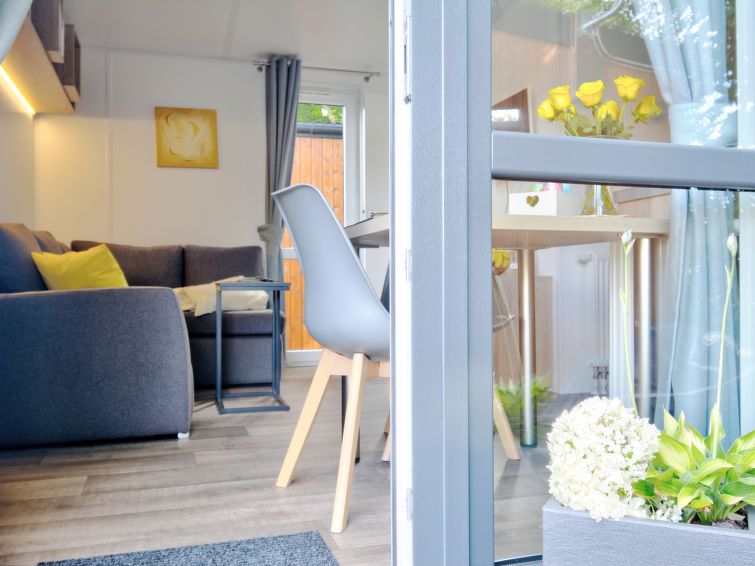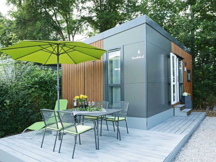 "Tiny Haus Kuschelnest", 2-room mobile home 25 m2. Object suitable for 2 adults + 2 children. Cosy furnishings: living/sleeping room with 1 sofabed (120 cm, length 170 cm), satellite TV. Exit to the terrace. 1 room with 1 french bed (140 cm, length 200 cm). Open kitchen (oven, Gas stove, 2 gas rings, kettle, electric coffee machine).