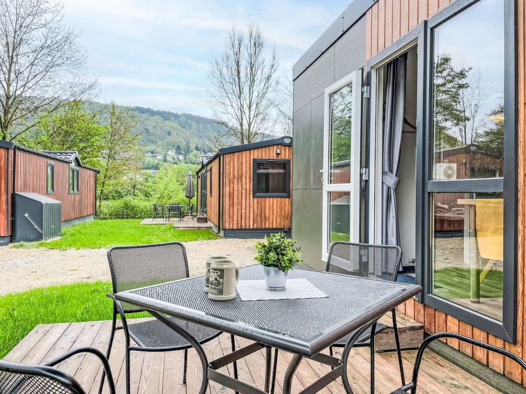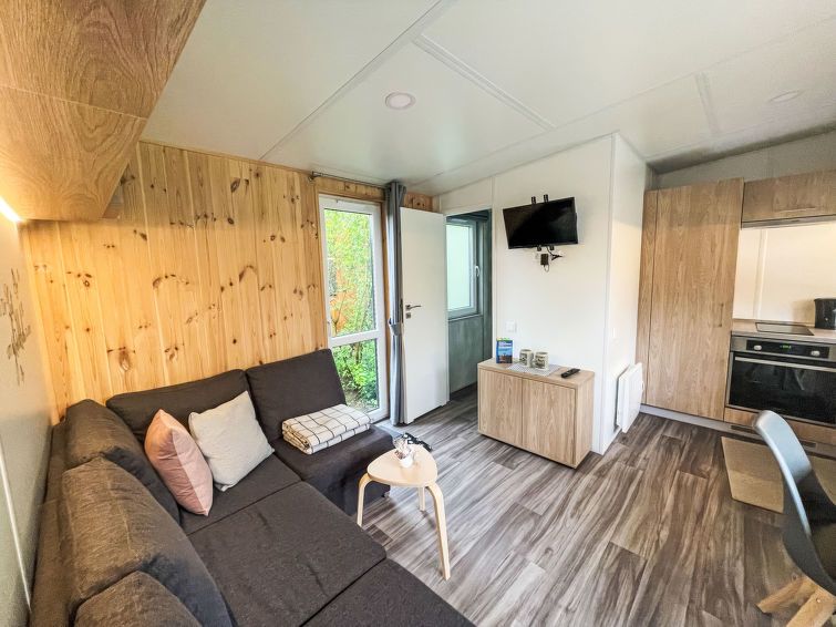 "Rinas Kuschelnest", 2-room mobile home 24 m2. Object suitable for 2 adults + 2 children. Cosy furnishings: living/sleeping room with 1 sofabed (120 cm, length 170 cm). 1 room with 1 french bed (140 cm, length 200 cm). Open kitchen (oven, 2 ceramic glass hob hotplates, toaster, kettle, microwave, electric coffee machine).