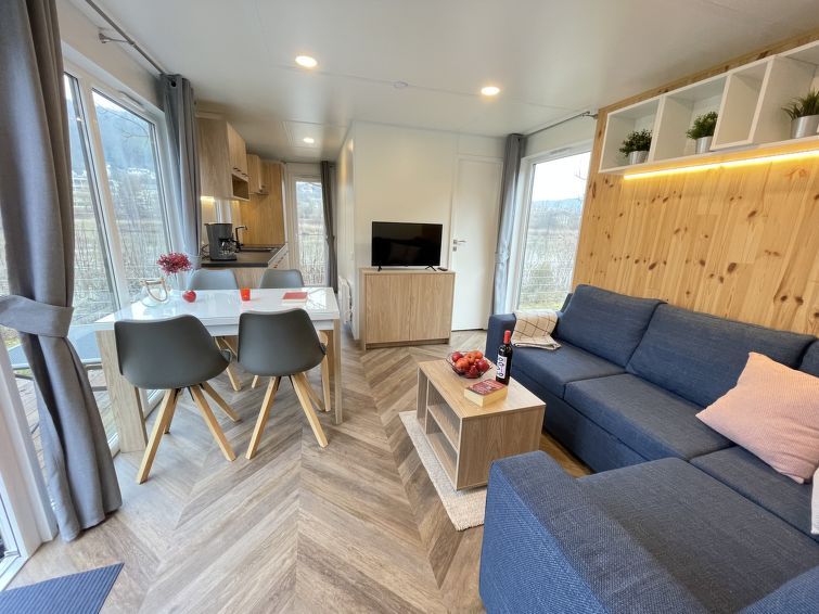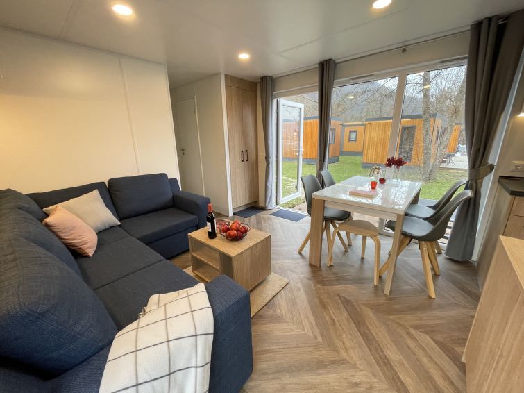 "Tiny Haus Altmühlblick II", 3-room mobile home 32 m2. Cosy furnishings: living/sleeping room with (120 cm, length 170 cm), satellite TV. Exit to the terrace. 1 room with 1 french bed (140 cm, length 200 cm). 1 room with 2 beds (80 cm, length 200 cm). Open kitchen (4 ceramic glass hob hotplates, kettle, electric coffee machine).