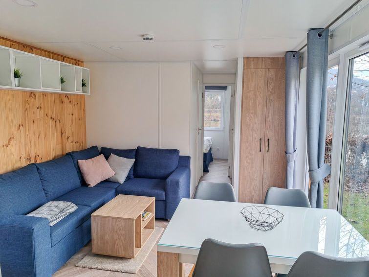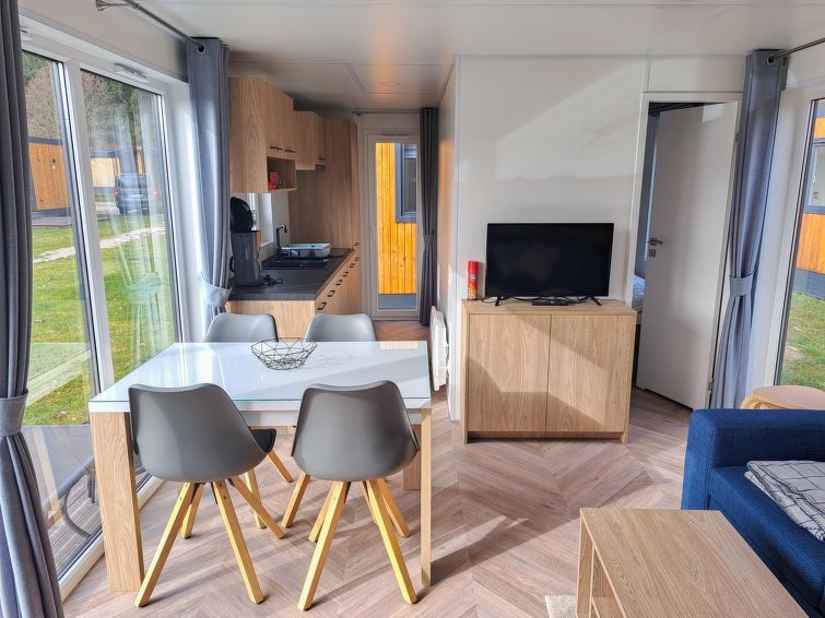 "Tiny Haus Altmühlblick III", 3-room mobile home 32 m2. Cosy furnishings: living/sleeping room with (120 cm, length 170 cm), satellite TV. Exit to the terrace. 1 room with 1 french bed (140 cm, length 190 cm). 1 room with 2 beds (70 cm, length 190 cm). Open kitchen (4 ceramic glass hob hotplates, kettle, electric coffee machine).