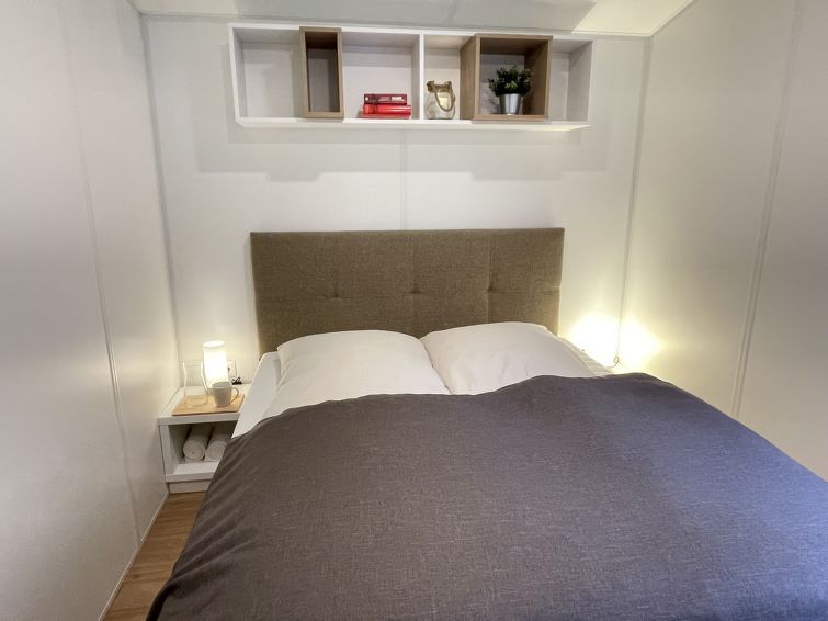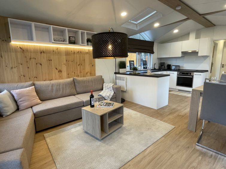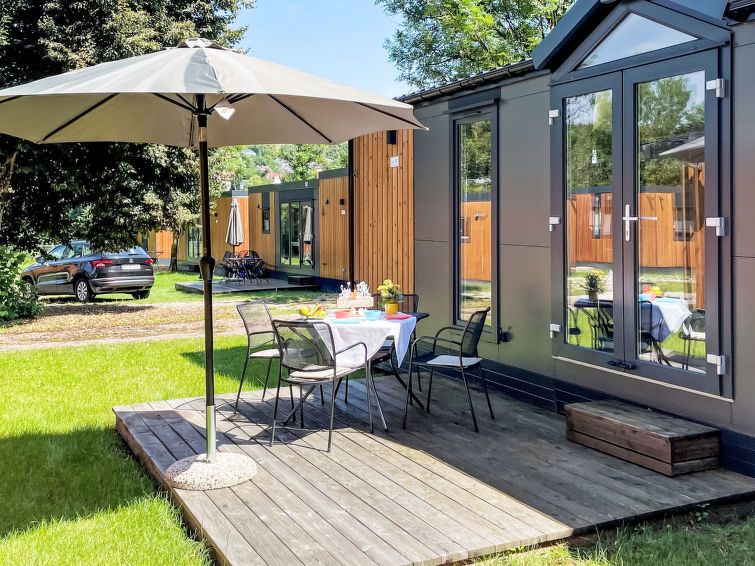 "Tiny Haus Altmühlpanorama", 3-room mobile home 48 m2. Comfortable furnishings: living/sleeping room with 1 double sofabed (160 cm, length 200 cm), Scandinavian wood stove (only for decoration), satellite TV and air conditioning. Exit to the terrace. 1 room with 1 french bed (160 cm, length 200 cm).