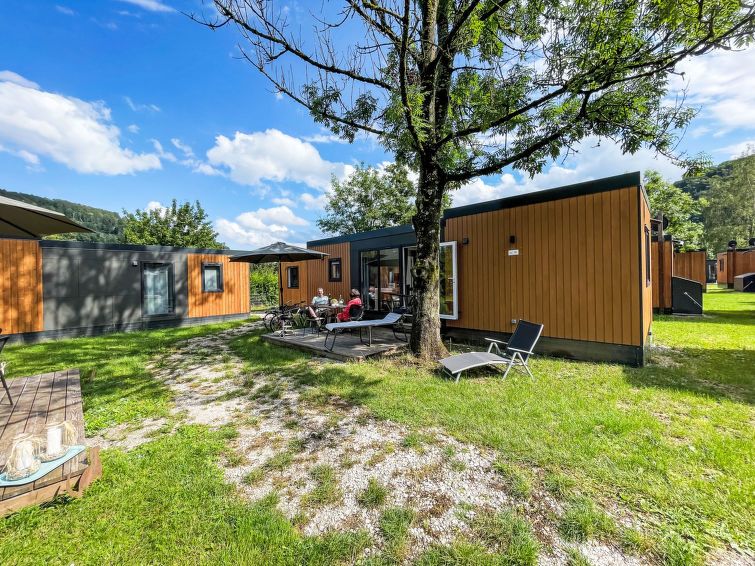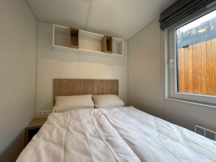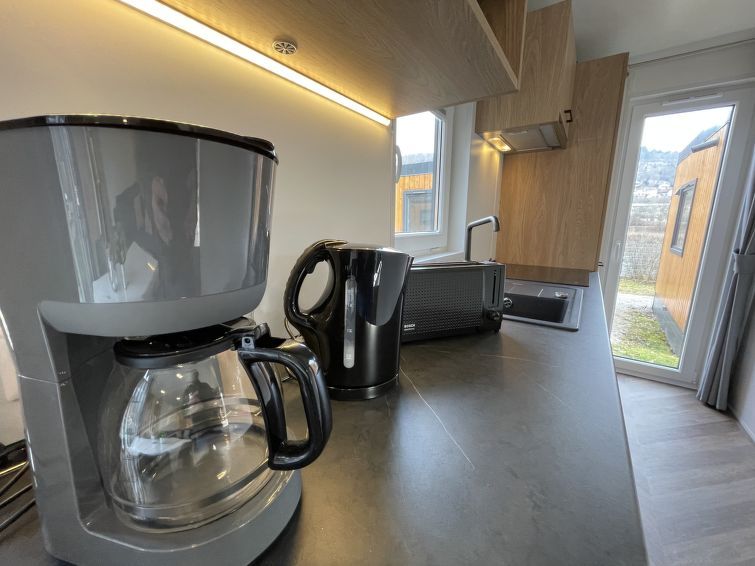 "Tiny Haus Anellie", 3-room mobile home 32 m2. Cosy furnishings: living/sleeping room with (120 cm, length 170 cm), satellite TV. Exit to the terrace. 1 room with 1 french bed (140 cm, length 200 cm). 1 room with 2 beds (80 cm, length 200 cm). Open kitchen (4 ceramic glass hob hotplates, kettle, electric coffee machine).