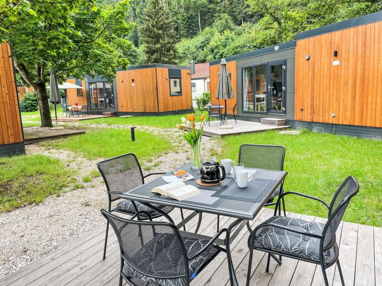 "Tiny Haus Auszeit", 3-room mobile home 32 m2. Cosy furnishings: living/sleeping room with (120 cm, length 170 cm), satellite TV. Exit to the terrace. 1 room with 1 french bed (140 cm, length 190 cm). 1 room with 2 beds (70 cm, length 190 cm). Open kitchen (4 ceramic glass hob hotplates, kettle, electric coffee machine).