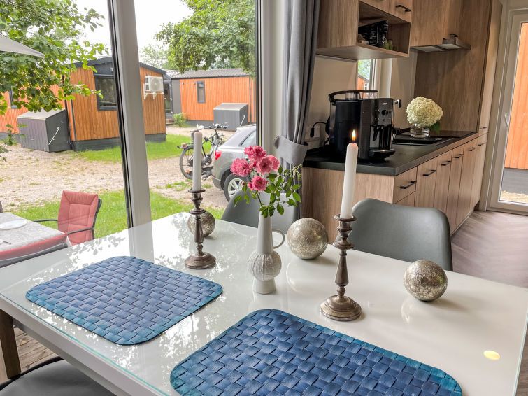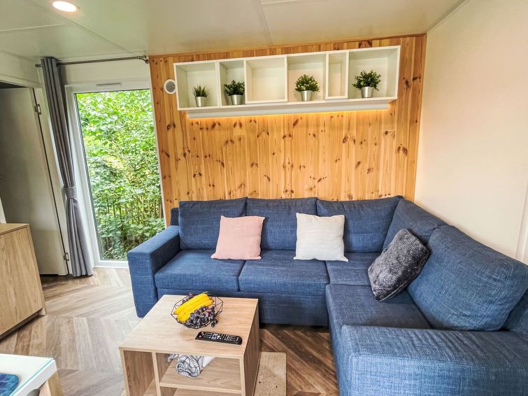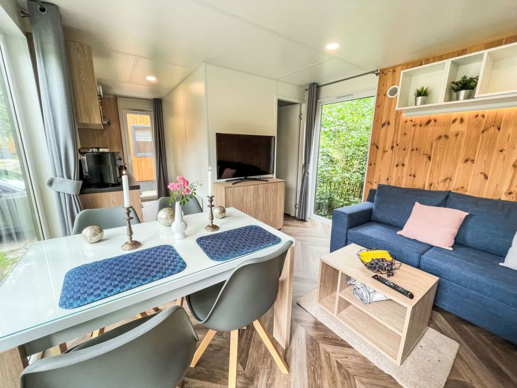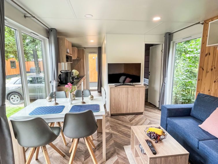 "Tiny Haus Bavaria", 3-room mobile home 32 m2. Cosy furnishings: living/sleeping room with (120 cm, length 170 cm), satellite TV. Exit to the terrace. 1 room with 1 french bed (140 cm, length 200 cm). 1 room with 2 beds (80 cm, length 200 cm). Open kitchen (4 ceramic glass hob hotplates, kettle, electric coffee machine).