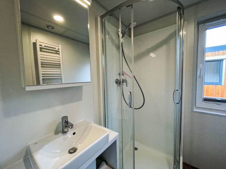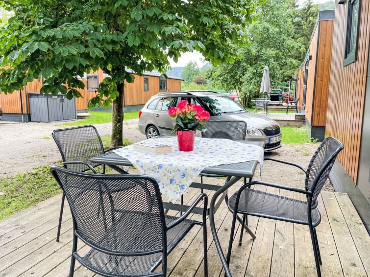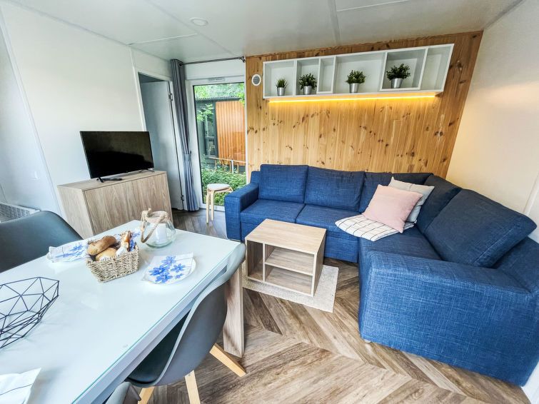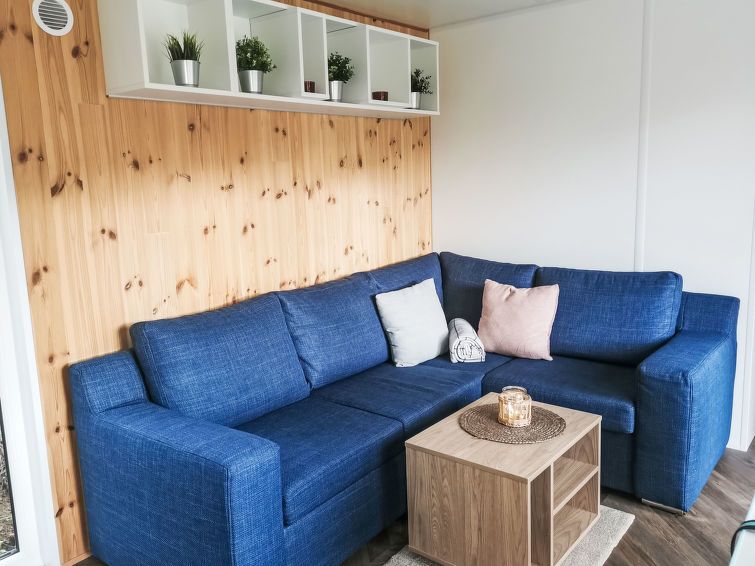 "Tiny Haus Birkenlodge", 3-room mobile home 32 m2. Cosy furnishings: living/sleeping room with (120 cm, length 170 cm), satellite TV. Exit to the terrace. 1 room with 1 french bed (140 cm, length 200 cm). 1 room with 2 beds (80 cm, length 200 cm). Open kitchen (4 ceramic glass hob hotplates, kettle, electric coffee machine).