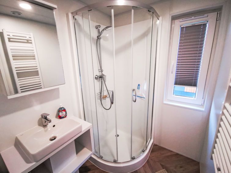 "Tiny Haus Christas Angler-Oase", 3-room mobile home 32 m2. Cosy furnishings: living/sleeping room with (120 cm, length 170 cm), satellite TV. Exit to the terrace. 1 room with 1 french bed (140 cm, length 190 cm). 1 room with 2 beds (70 cm, length 190 cm). Open kitchen (4 ceramic glass hob hotplates, toaster, kettle, microwave, electric coffee machine).