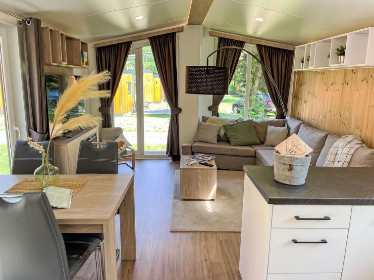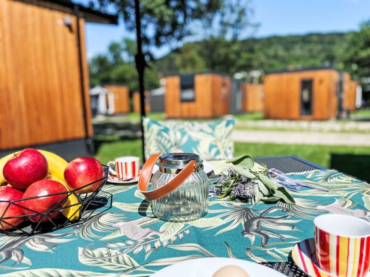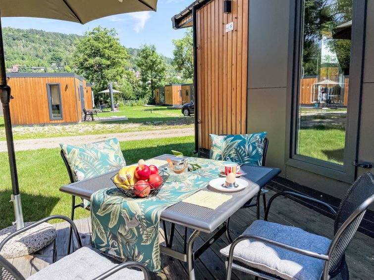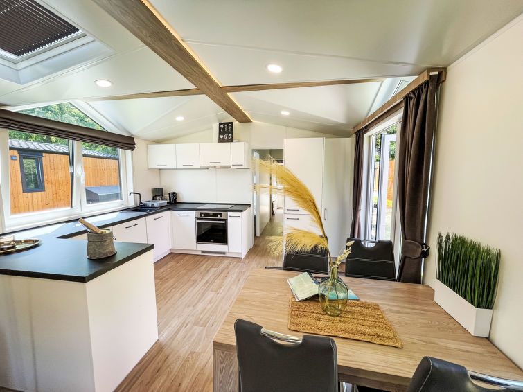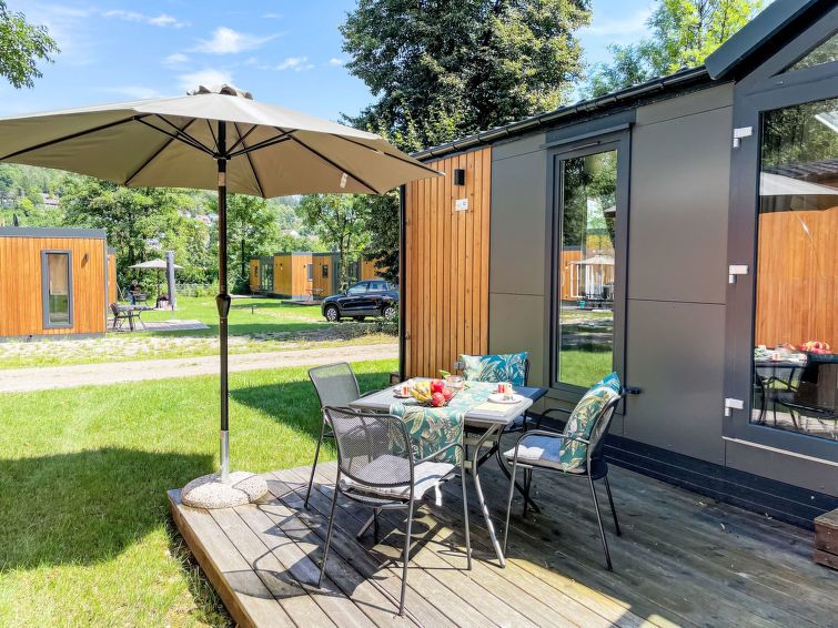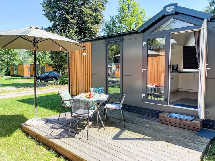 "Tiny Haus ChrisTine", 3-room mobile home 48 m2. Object suitable for 2 adults + 4 children. Comfortable furnishings: living/sleeping room with 1 double sofabed (160 cm, length 200 cm), Scandinavian wood stove (only for decoration), satellite TV and air conditioning. Exit to the terrace.