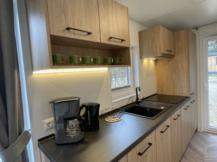 "Tiny Haus Elena", 3-room mobile home 32 m2. Cosy furnishings: living/sleeping room with (120 cm, length 170 cm), satellite TV. Exit to the terrace. 1 room with 1 french bed (140 cm, length 190 cm). 1 room with 2 beds (70 cm, length 190 cm). Open kitchen (4 ceramic glass hob hotplates, kettle, electric coffee machine).