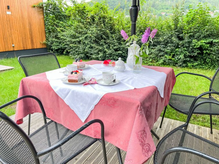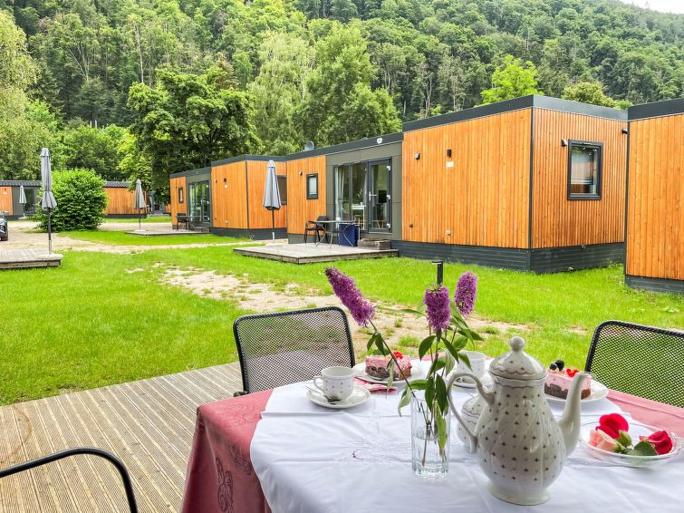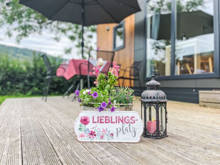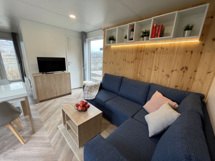 "Tiny Haus Panorama", 3-room mobile home 32 m2. Cosy furnishings: living/sleeping room with (120 cm, length 170 cm), satellite TV. Exit to the terrace. 1 room with 1 french bed (140 cm, length 190 cm). 1 room with 2 beds (70 cm, length 190 cm). Open kitchen (4 induction hot plates, kettle, electric coffee machine).