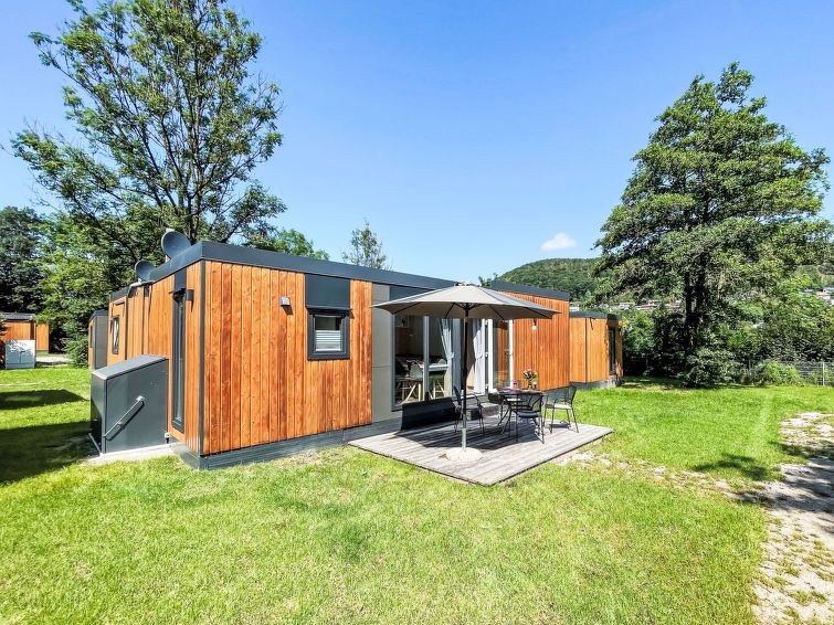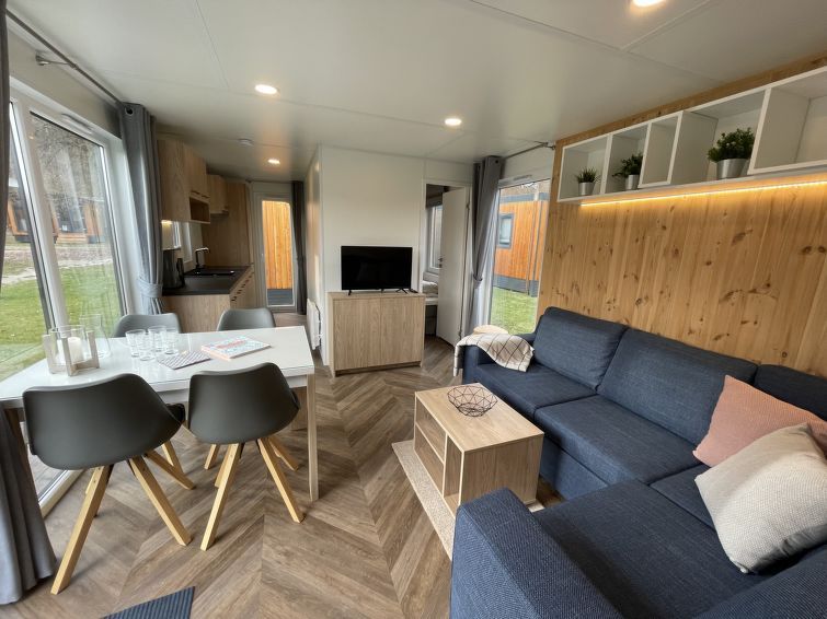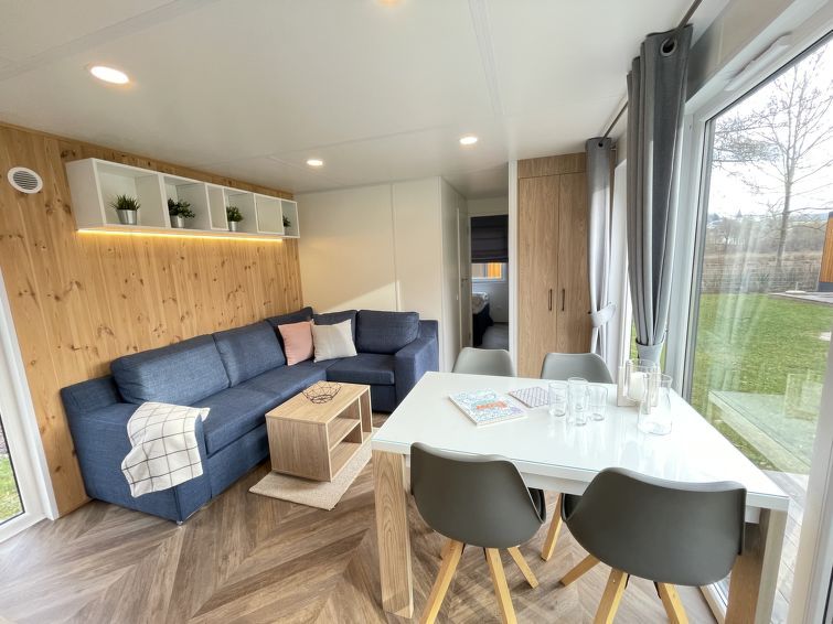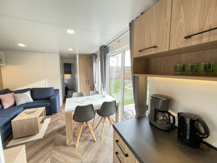 "Tiny Haus Xandra", 3-room mobile home 32 m2. Cosy furnishings: living/sleeping room with (120 cm, length 170 cm), satellite TV. Exit to the terrace. 1 room with 1 french bed (140 cm, length 200 cm). 1 room with 2 beds (80 cm, length 200 cm). Open kitchen (4 ceramic glass hob hotplates, kettle, electric coffee machine).