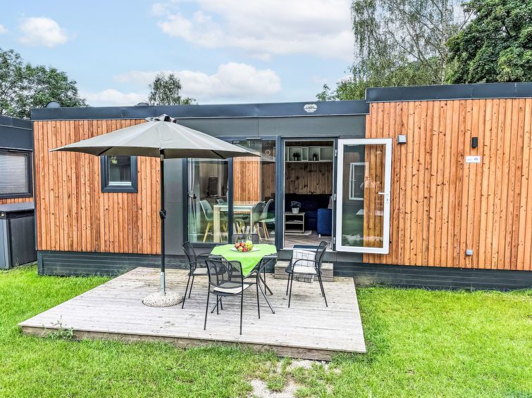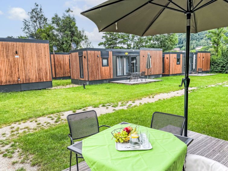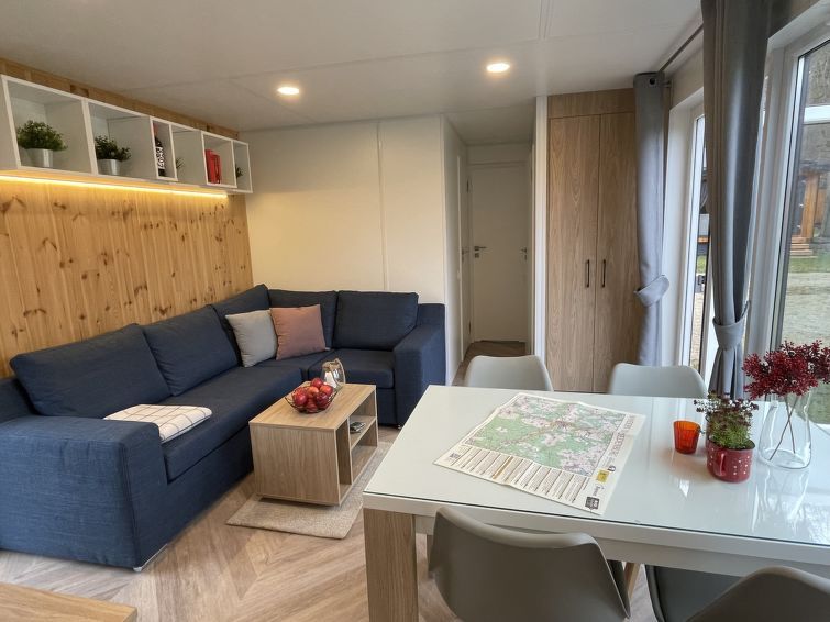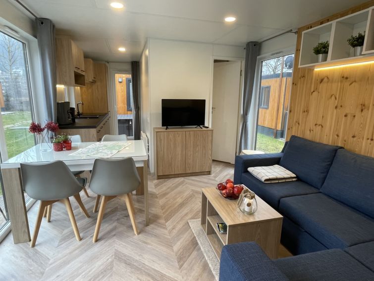 "Villa Ramses", 3-room mobile home 32 m2. Cosy furnishings: living/sleeping room with 1 double sofabed (120 cm, length 170 cm), satellite TV. Exit to the terrace. 1 room with 1 french bed (140 cm, length 200 cm). 1 room with 2 beds. Open kitchen (4 ceramic glass hob hotplates, kettle, electric coffee machine).