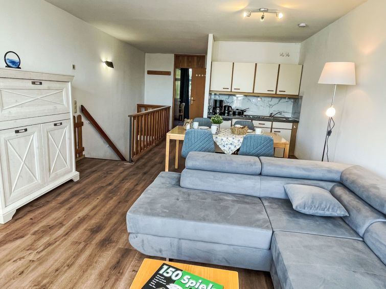 "Familienspaß inkl. Schwimmbad und Sauna", 2-room apartment 53 m2 on 2nd floor. Object suitable for 2 adults + 2 children. Tasteful furnishings: living/sleeping room with 1 sofabed, dining table and satellite TV (flat screen). Exit to the balcony. 1 room with 1 x 2 bunk beds (80 cm, length 180 cm), 1 double bed (180 cm, length 200 cm).