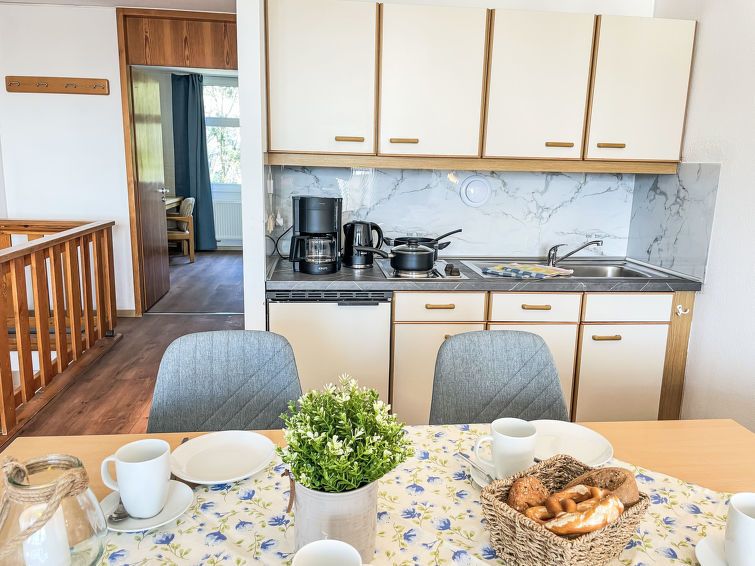 We felt very comfortable in the apartment. Everything was clean, comfortably furnished, and well-equipped – the kitchen, in particular, left nothing to be desired. The balcony with its parasol and clothes rack is a lovely place to relax. The swimming pool, the outdoor pool in summer, as well as the sauna and infrared sauna are also great extras. Although everything is a bit older, it is very well maintained and in good condition.