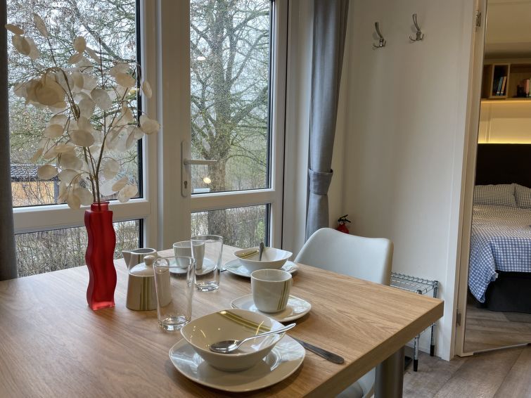 "Tiny Haus Eulenheim", 2-room mobile home 25 m2. Object suitable for 2 adults + 2 children. Cosy furnishings: living/sleeping room with 1 double sofabed and satellite TV. Exit to the terrace. 1 room with 1 french bed (140 cm, length 200 cm). Open kitchen (oven, 2 induction hot plates, toaster, kettle, microwave, electric coffee machine).