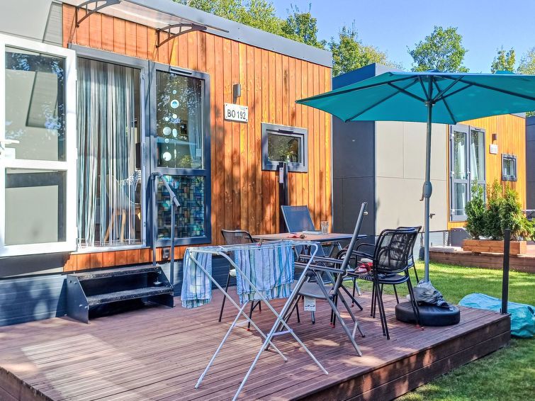 "Tiny Haus Karin", 2-room mobile home 25 m2. Object suitable for 2 adults + 2 children. Cosy furnishings: living/sleeping room with 1 double sofabed, dining table and satellite TV (flat screen). Exit to the terrace. 1 room with 1 french bed (140 cm, length 200 cm). Kitchenette (oven, 2 induction hot plates, toaster, kettle, electric coffee machine).