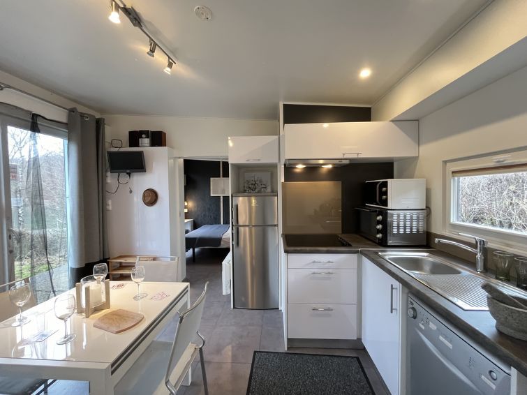 "Tiny Haus Micha", 3-room mobile home 37 m2, on the ground floor. Cosy furnishings: living/sleeping room with 1 double sofabed (140 cm, length 200 cm), satellite TV. Exit to the terrace. 1 double bedroom. 1 room with 2 beds. Open kitchen (dishwasher, Gas stove, 4 gas rings, kettle, microwave, electric coffee machine).